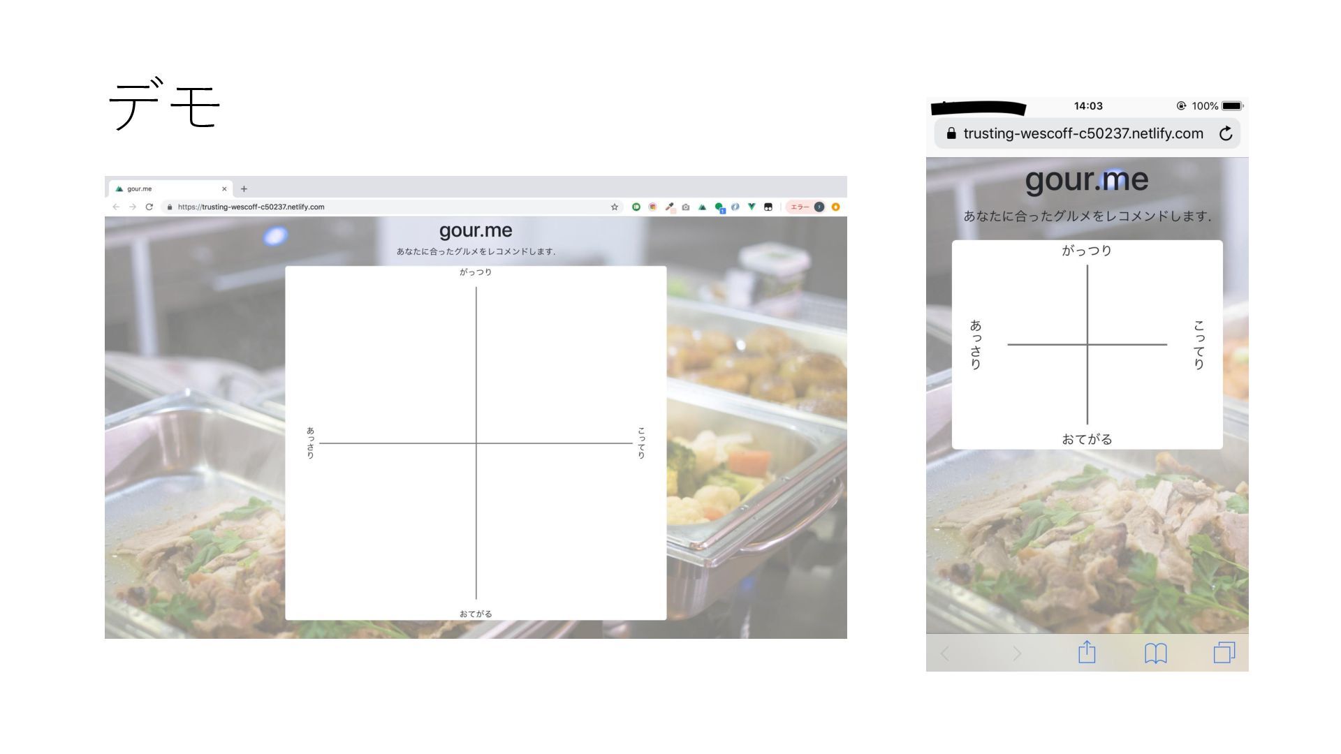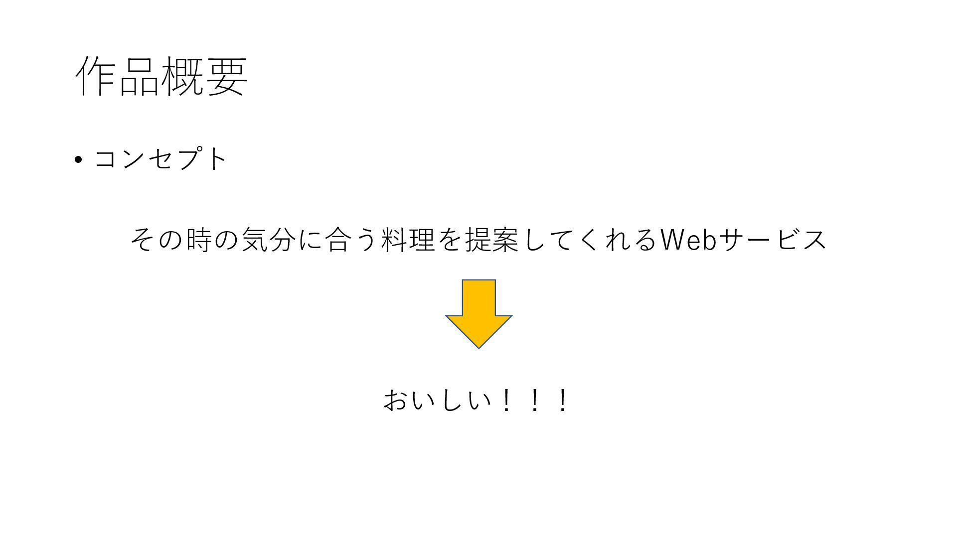 作品概要 • コンセプト その時の気分に合う料理を提案してくれるWebサービス おいしい!!!