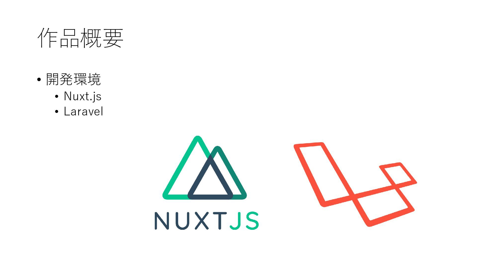 作品概要 • 開発環境 • Nuxt.js • Laravel
