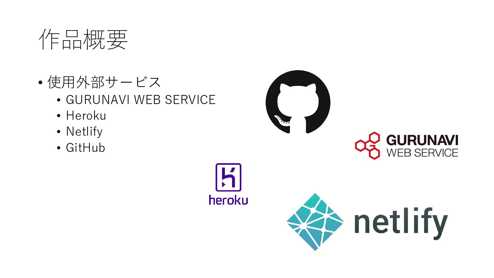 作品概要 • 使用外部サービス • GURUNAVI WEB SERVICE • Heroku •