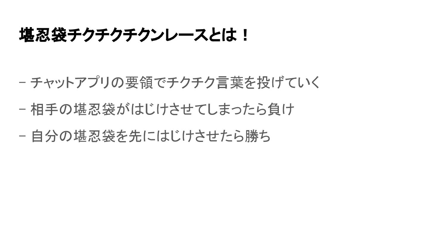 堪忍袋チクチクチクンレースとは! - チャットアプリの要領でチクチク言葉を投げていく - 相手の堪忍袋がはじけさせてしまったら負け - 自分の堪忍袋を先にはじけさせたら勝ち