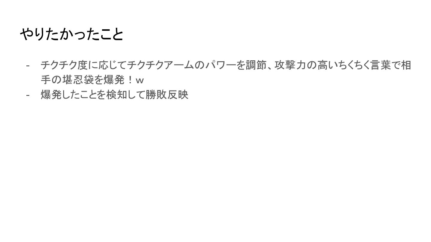 やりたかったこと - チクチク度に応じてチクチクアームのパワーを調節、攻撃力の高いちくちく言葉で相 手の堪忍袋を爆発!w - 爆発したことを検知して勝敗反映