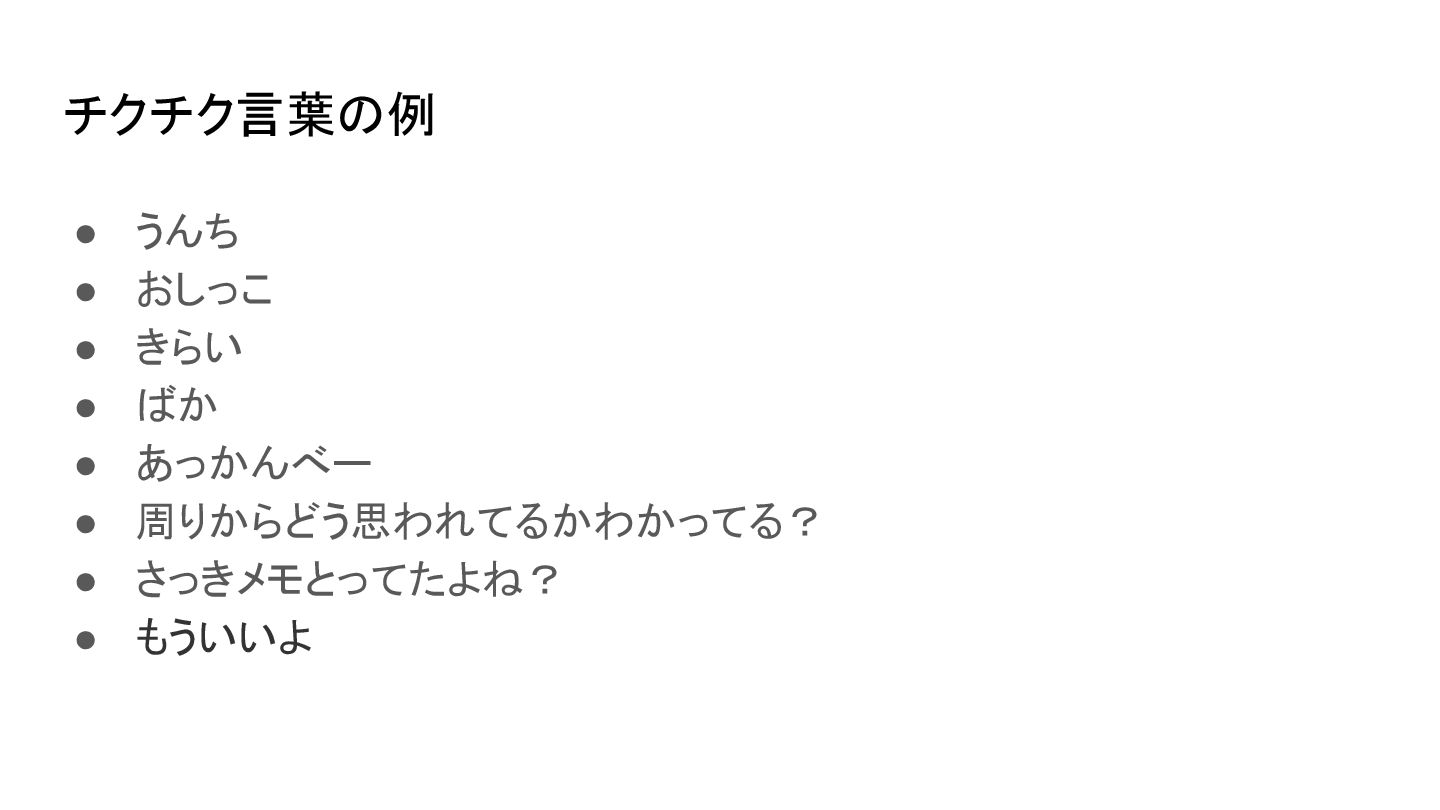 チクチク言葉の例 • うんち • おしっこ • きらい • ばか •