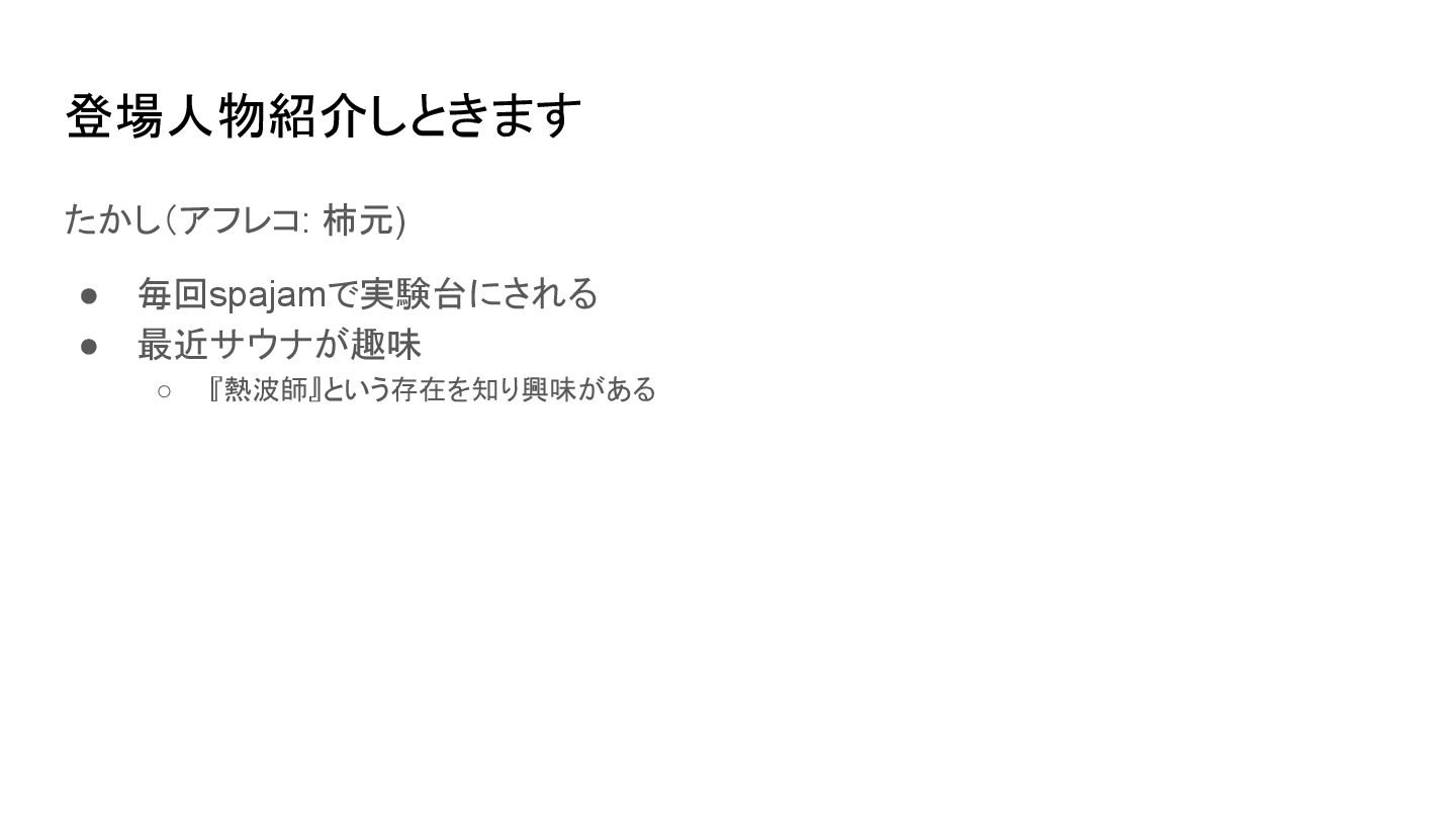 登場人物紹介しときます たかし(アフレコ: 柿元) • 毎回spajamで実験台にされる • 最近サウナが趣味 ◦ 『熱波師』という存在を知り興味がある