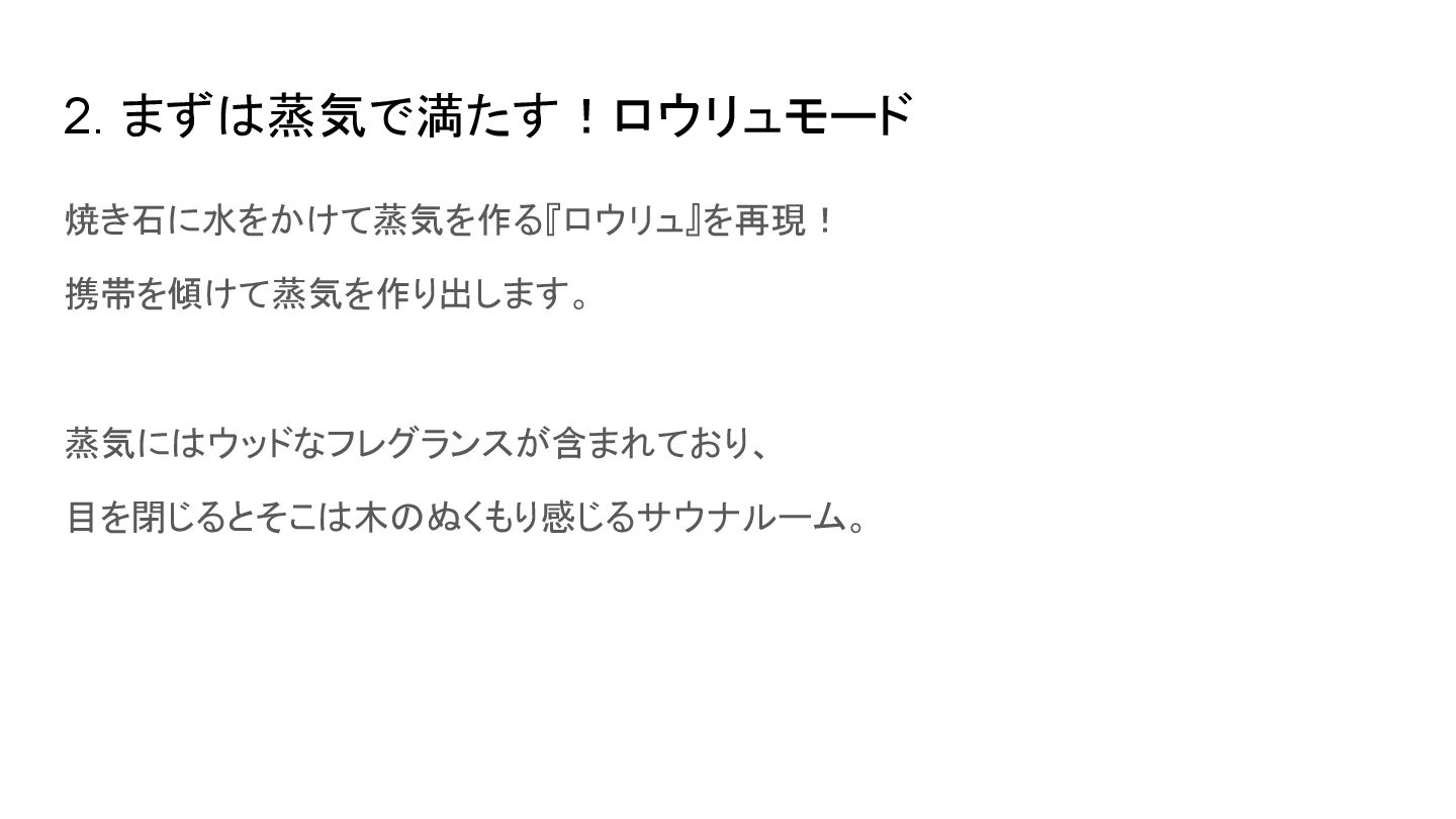 2. まずは蒸気で満たす!ロウリュモード 焼き石に水をかけて蒸気を作る『ロウリュ』を再現! 携帯を傾けて蒸気を作り出します。 蒸気にはウッドなフレグランスが含まれており、 目を閉じるとそこは木のぬくもり感じるサウナルーム。