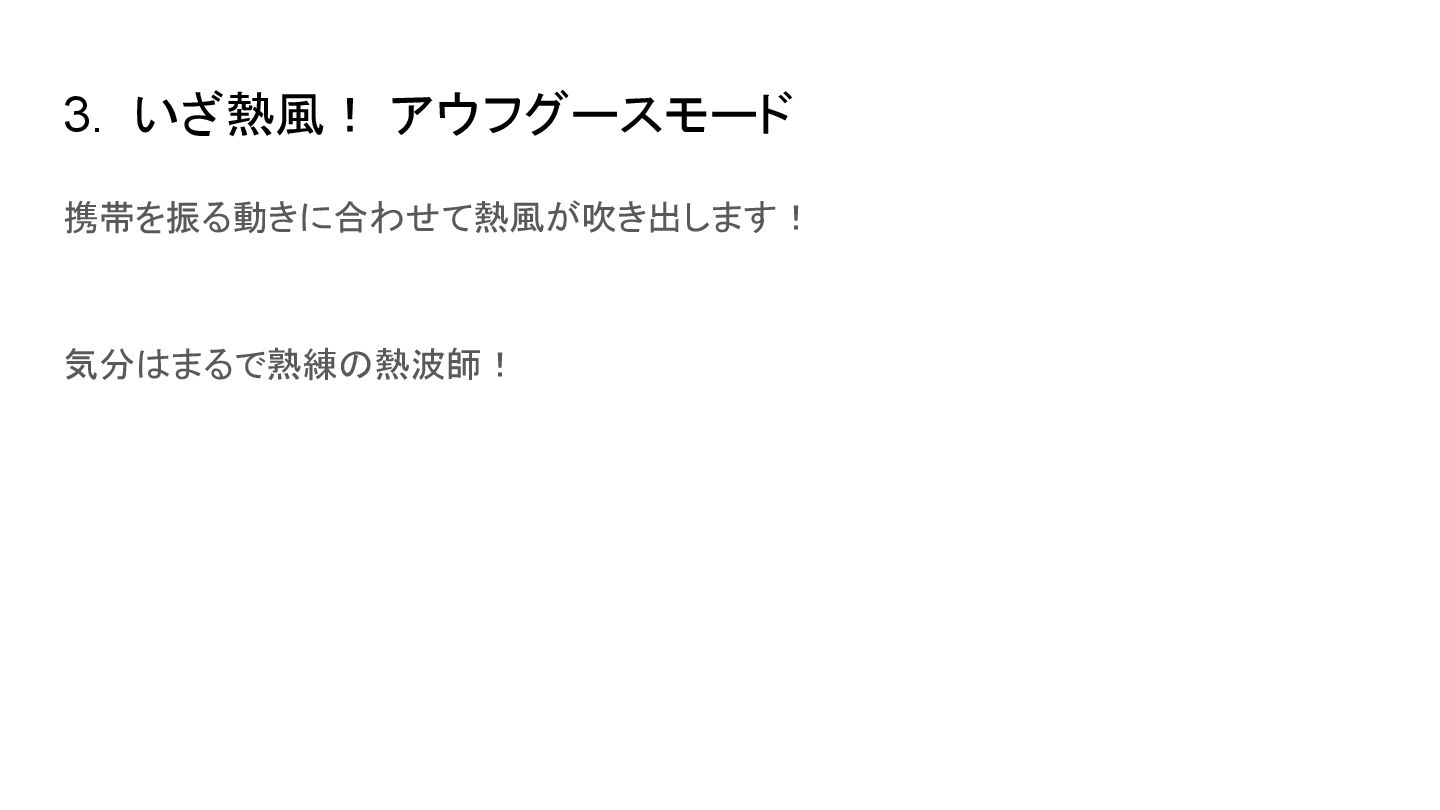 3. いざ熱風! アウフグースモード 携帯を振る動きに合わせて熱風が吹き出します! 気分はまるで熟練の熱波師!