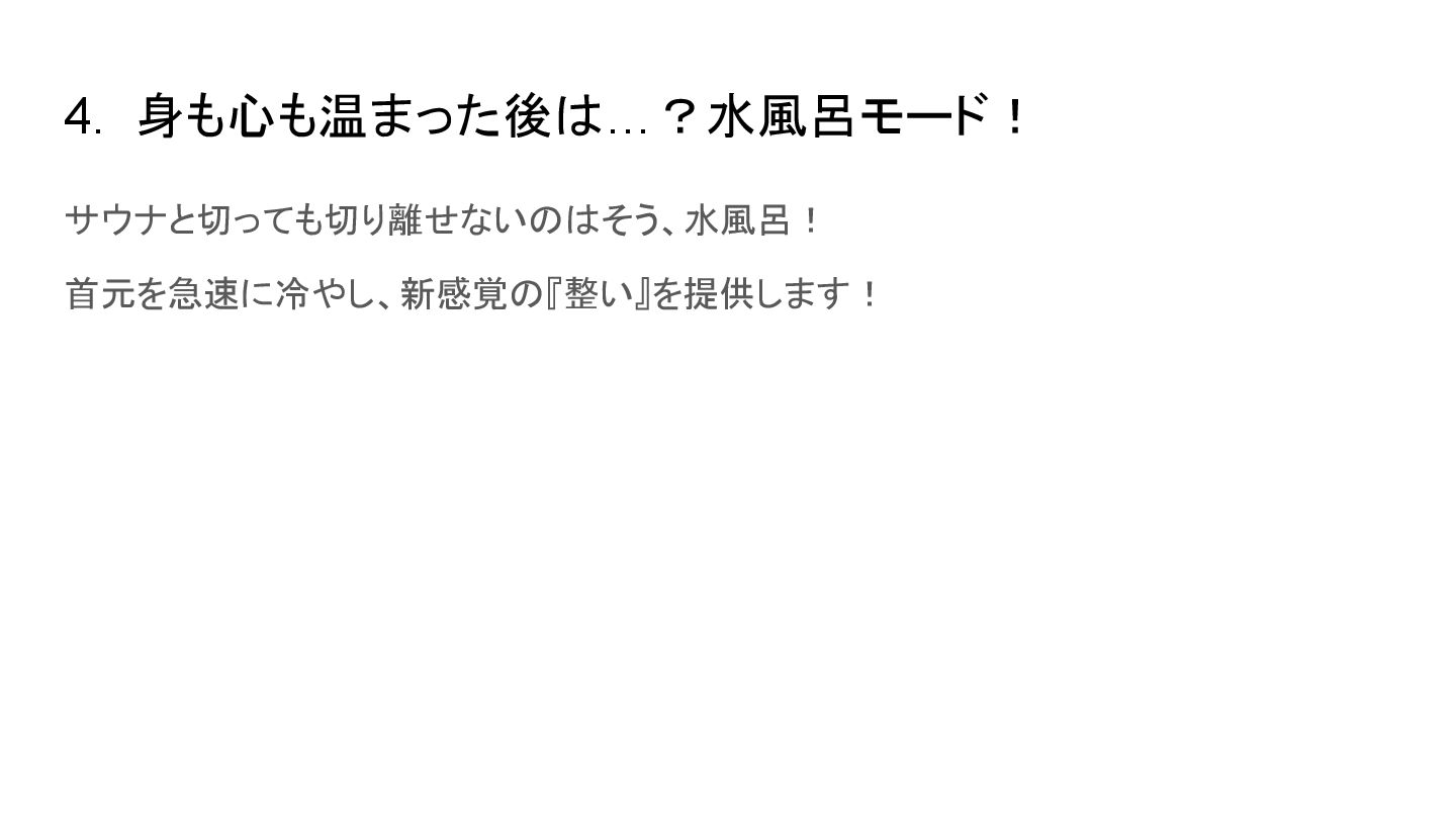 4. 身も心も温まった後は…?水風呂モード! サウナと切っても切り離せないのはそう、水風呂! 首元を急速に冷やし、新感覚の『整い』を提供します!