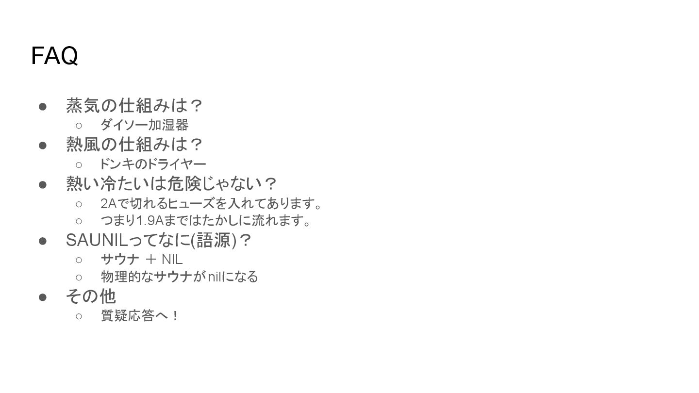 熱い冷たいは危険じゃない? ◦ 2Aで切れるヒューズを入れてあります。 ◦ つまり1.9Aまではたかしに流れます。 • SAUNILってなに(語源)? ◦ サウナ + NIL ◦ 物理的なサウナがnilになる • その他 ◦ 質疑応答へ!