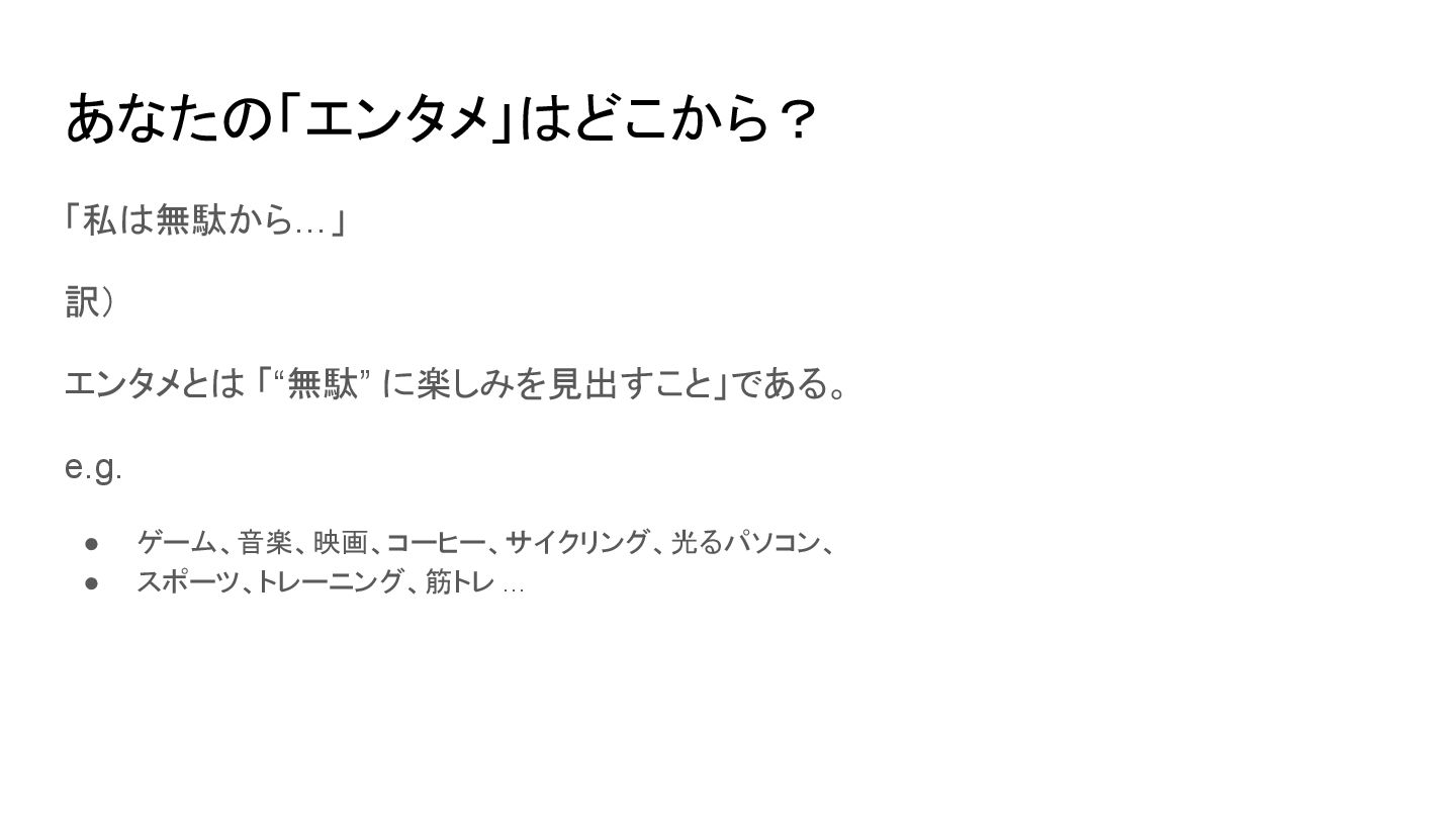あなたの「エンタメ」はどこから? 「私は無駄から…」 訳) エンタメとは 「“無駄” に楽しみを見出すこと」である。 e.g. • ゲーム、音楽、映画、コーヒー、サイクリング、光るパソコン、 •