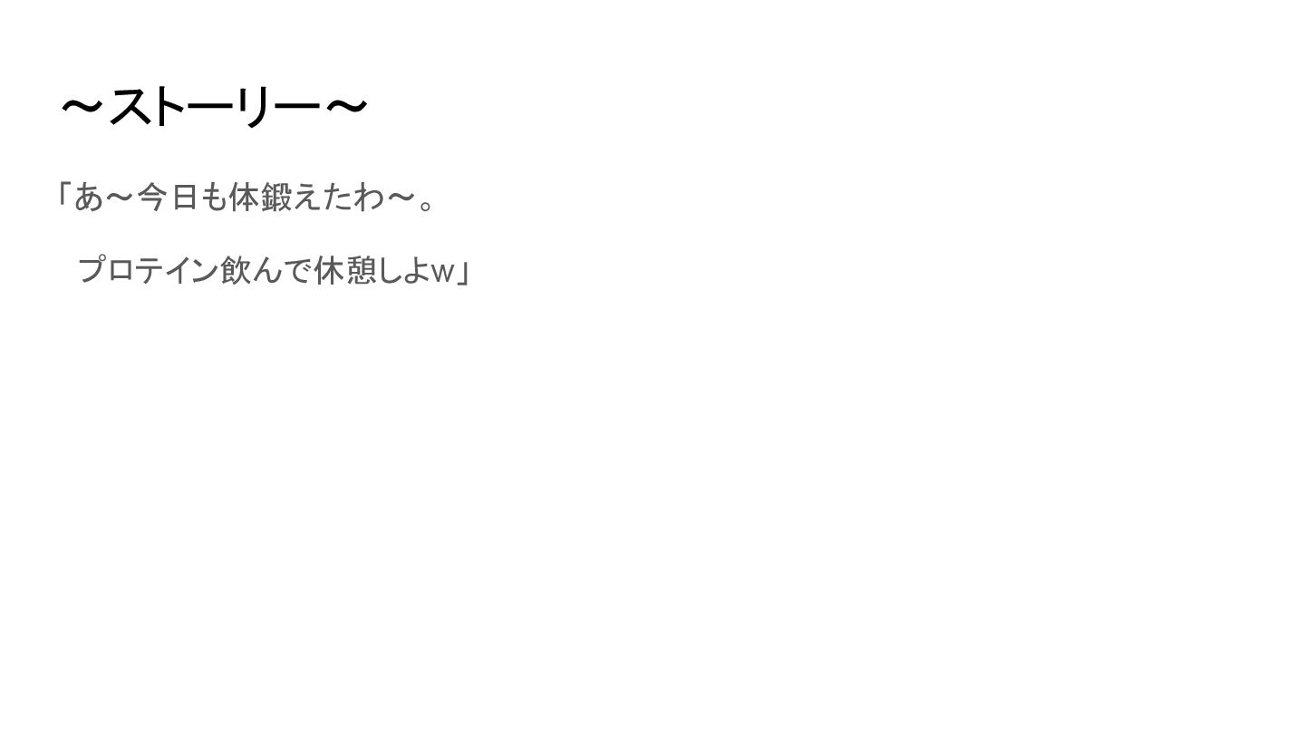 ~ストーリー~ 「あ~今日も体鍛えたわ~。 プロテイン飲んで休憩しよw」