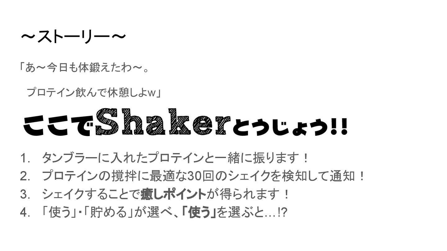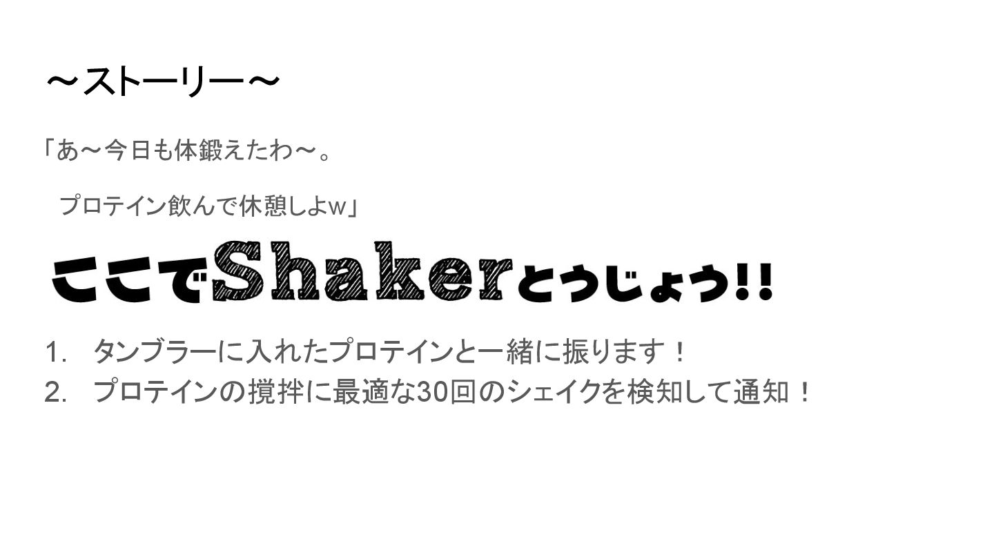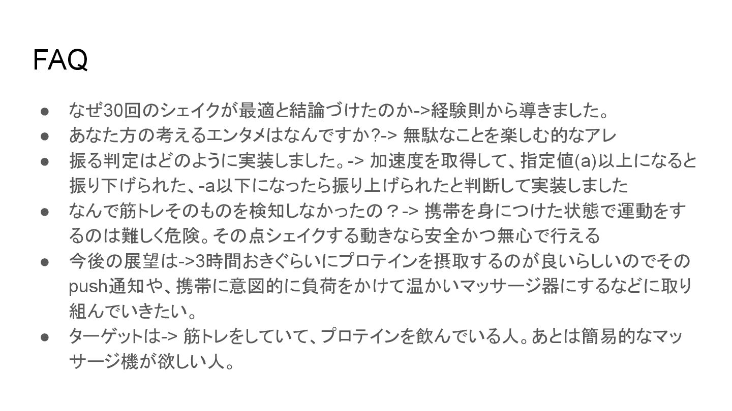 • なんで筋トレそのものを検知しなかったの?-> 携帯を身につけた状態で運動をす るのは難しく危険。その点シェイクする動きなら安全かつ無心で行える • 今後の展望は->3時間おきぐらいにプロテインを摂取するのが良いらしいのでその push通知や、携帯に意図的に負荷をかけて温かいマッサージ器にするなどに取り 組んでいきたい。 • ターゲットは-> 筋トレをしていて、プロテインを飲んでいる人。あとは簡易的なマッ サージ機が欲しい人。