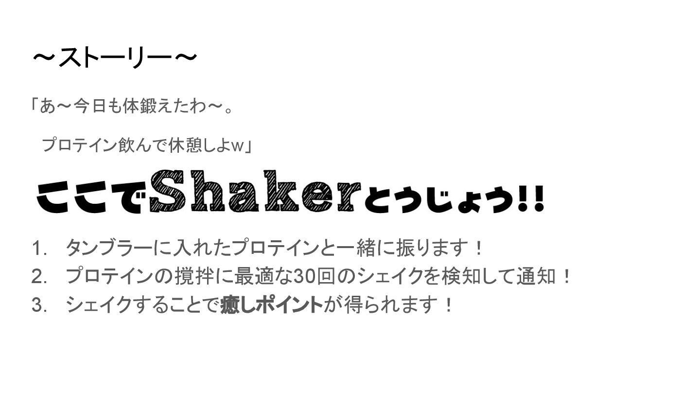 ~ストーリー~ 「あ~今日も体鍛えたわ~。 プロテイン飲んで休憩しよw」 1. タンブラーに入れたプロテインと一緒に振ります! 2. プロテインの撹拌に最適な30回のシェイクを検知して通知! 3. シェイクすることで癒しポイントが得られます!