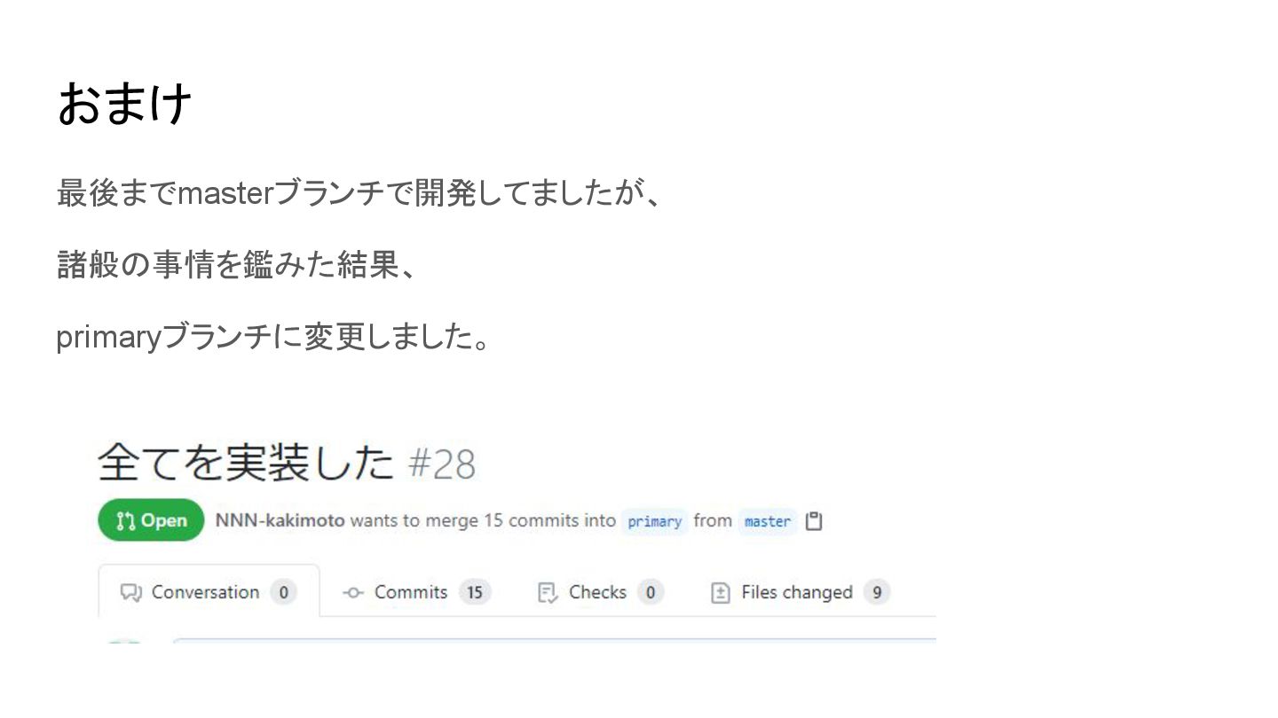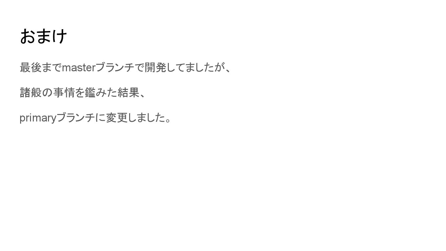 おまけ 最後までmasterブランチで開発してましたが、 諸般の事情を鑑みた結果、 primaryブランチに変更しました。