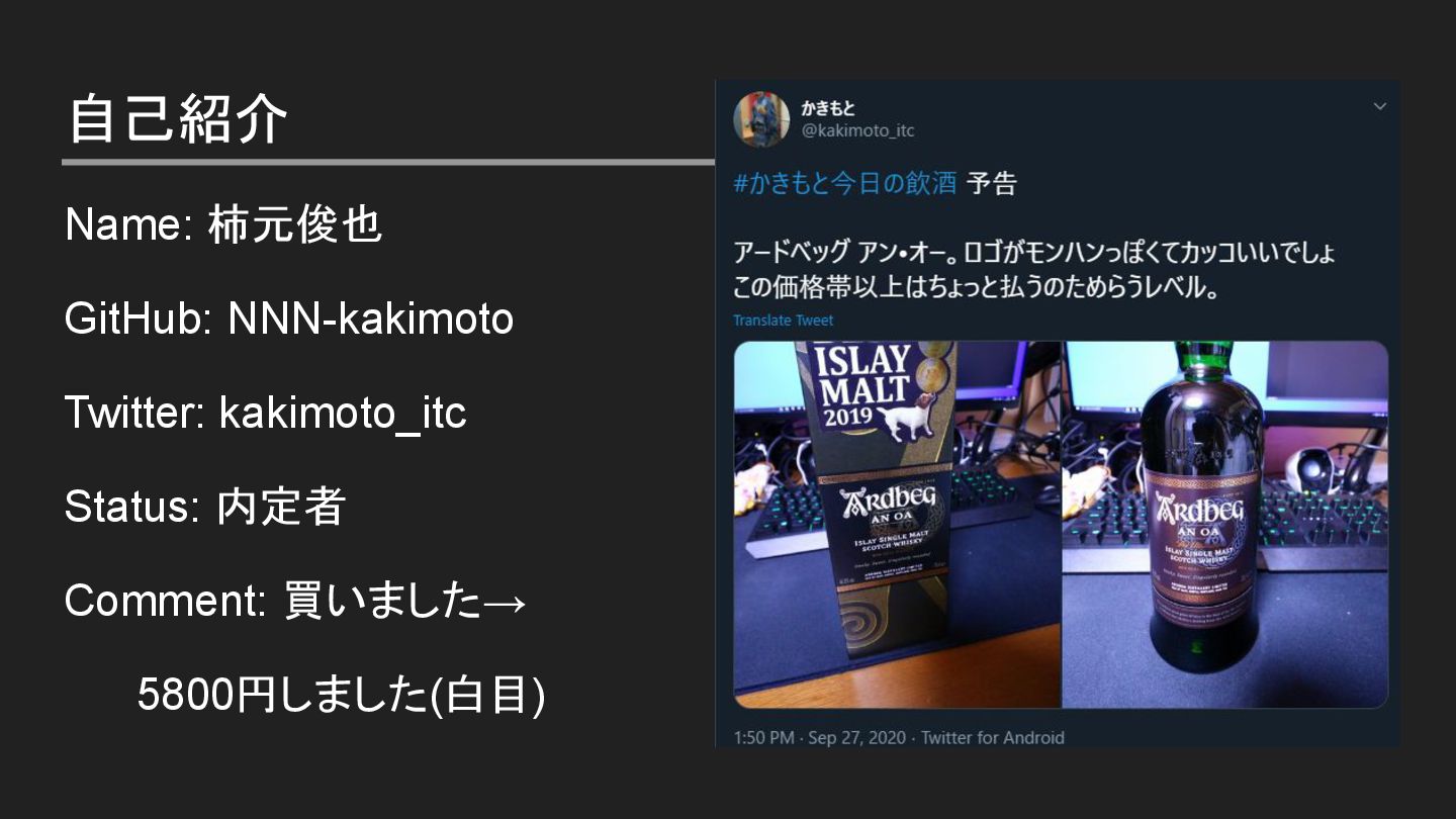 自己紹介 Name: 柿元俊也 GitHub: NNN-kakimoto Twitter: kakimoto_itc Status: 内定者 Comment: