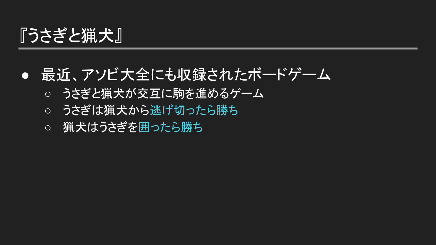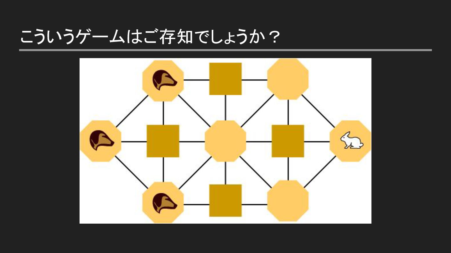 『うさぎと猟犬』 • 最近、アソビ大全にも収録されたボードゲーム ◦ うさぎと猟犬が交互に駒を進めるゲーム ◦ うさぎは猟犬から逃げ切ったら勝ち ◦ 猟犬はうさぎを囲ったら勝ち