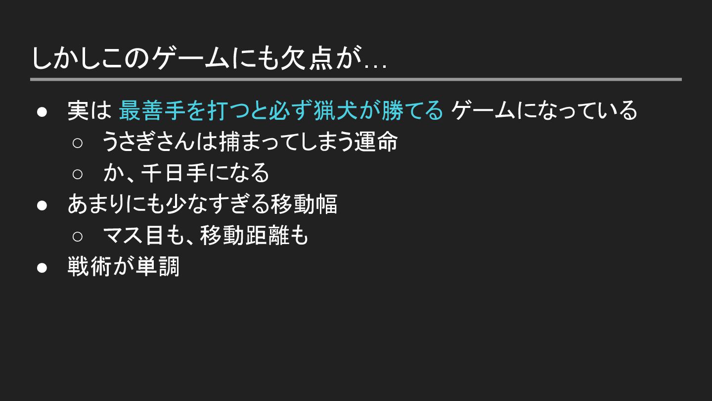 しかしこのゲームにも欠点が… • 実は 最善手を打つと必ず猟犬が勝てる ゲームになっている ◦ うさぎさんは捕まってしまう運命 ◦ か、千日手になる •
