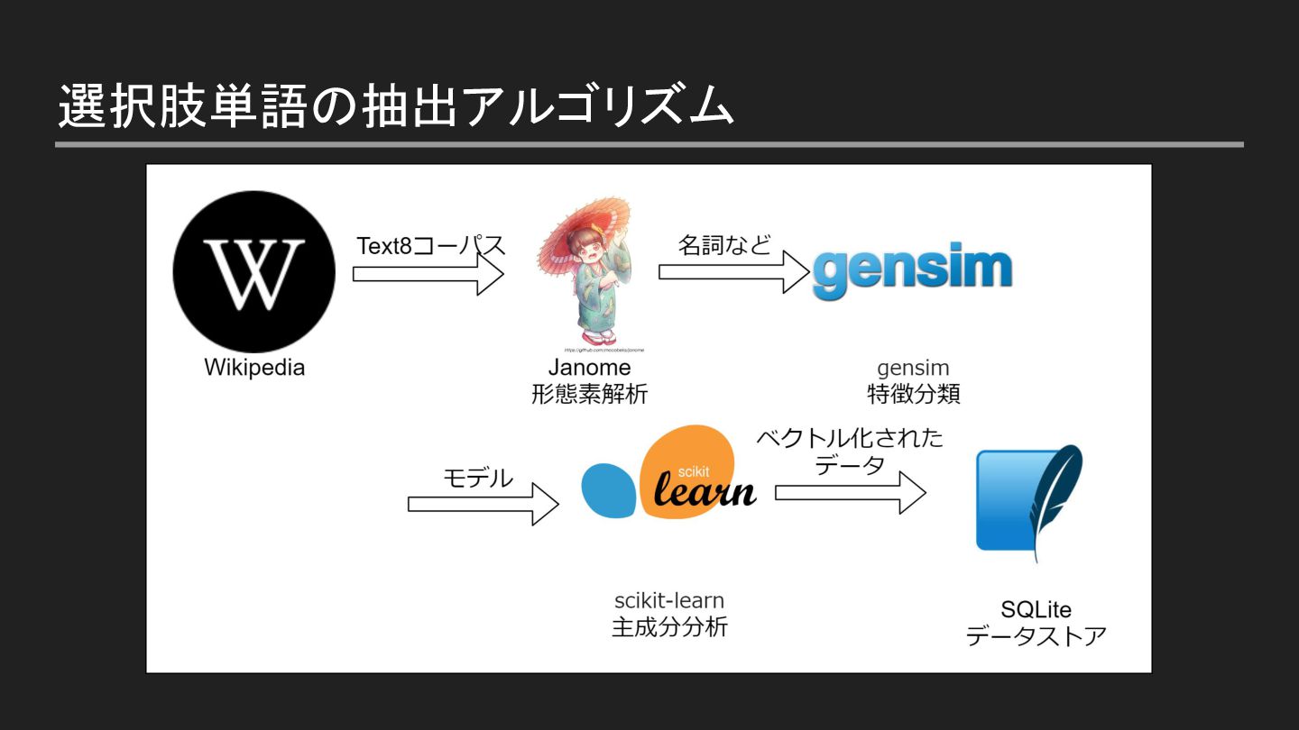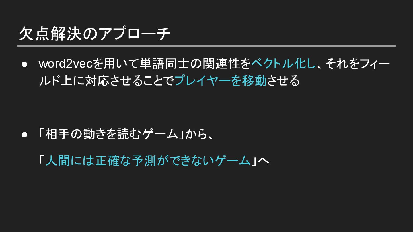 欠点解決のアプローチ • word2vecを用いて単語同士の関連性をベクトル化し、それをフィー ルド上に対応させることでプレイヤーを移動させる • 「相手の動きを読むゲーム」から、 「人間には正確な予測ができないゲーム」へ