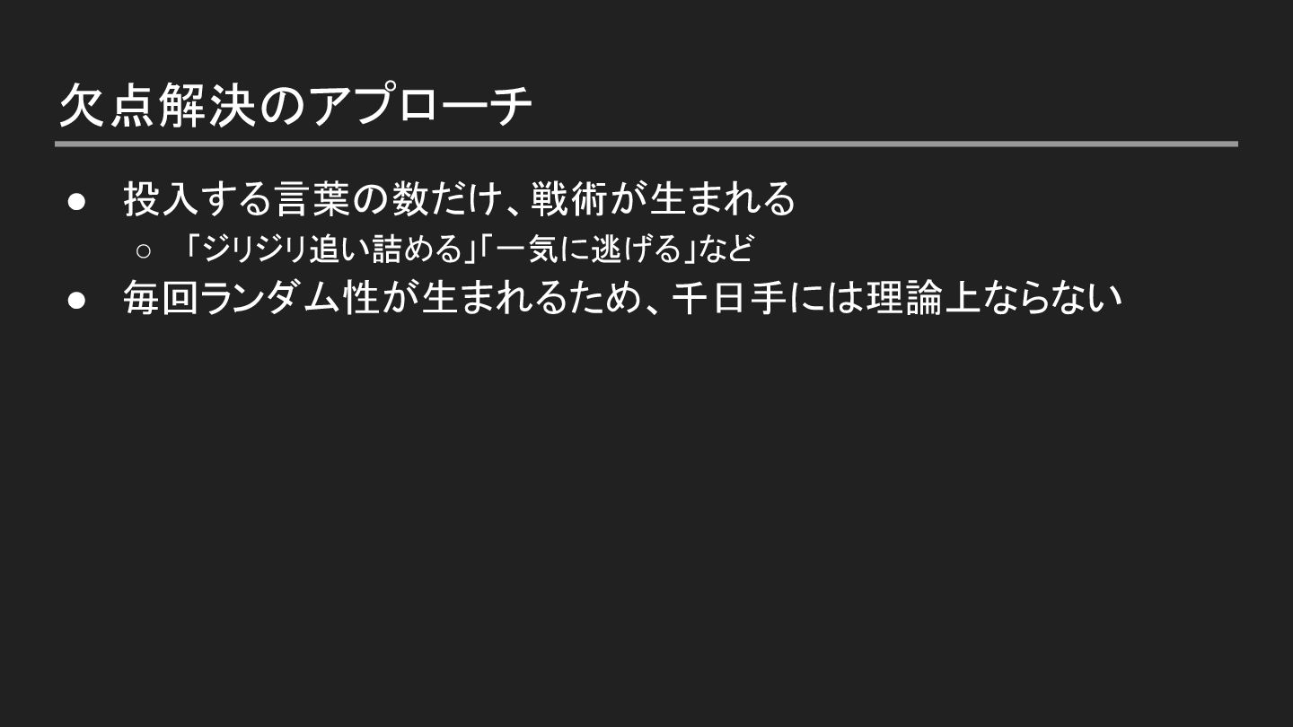 欠点解決のアプローチ • 投入する言葉の数だけ、戦術が生まれる ◦ 「ジリジリ追い詰める」「一気に逃げる」など • 毎回ランダム性が生まれるため、千日手には理論上ならない