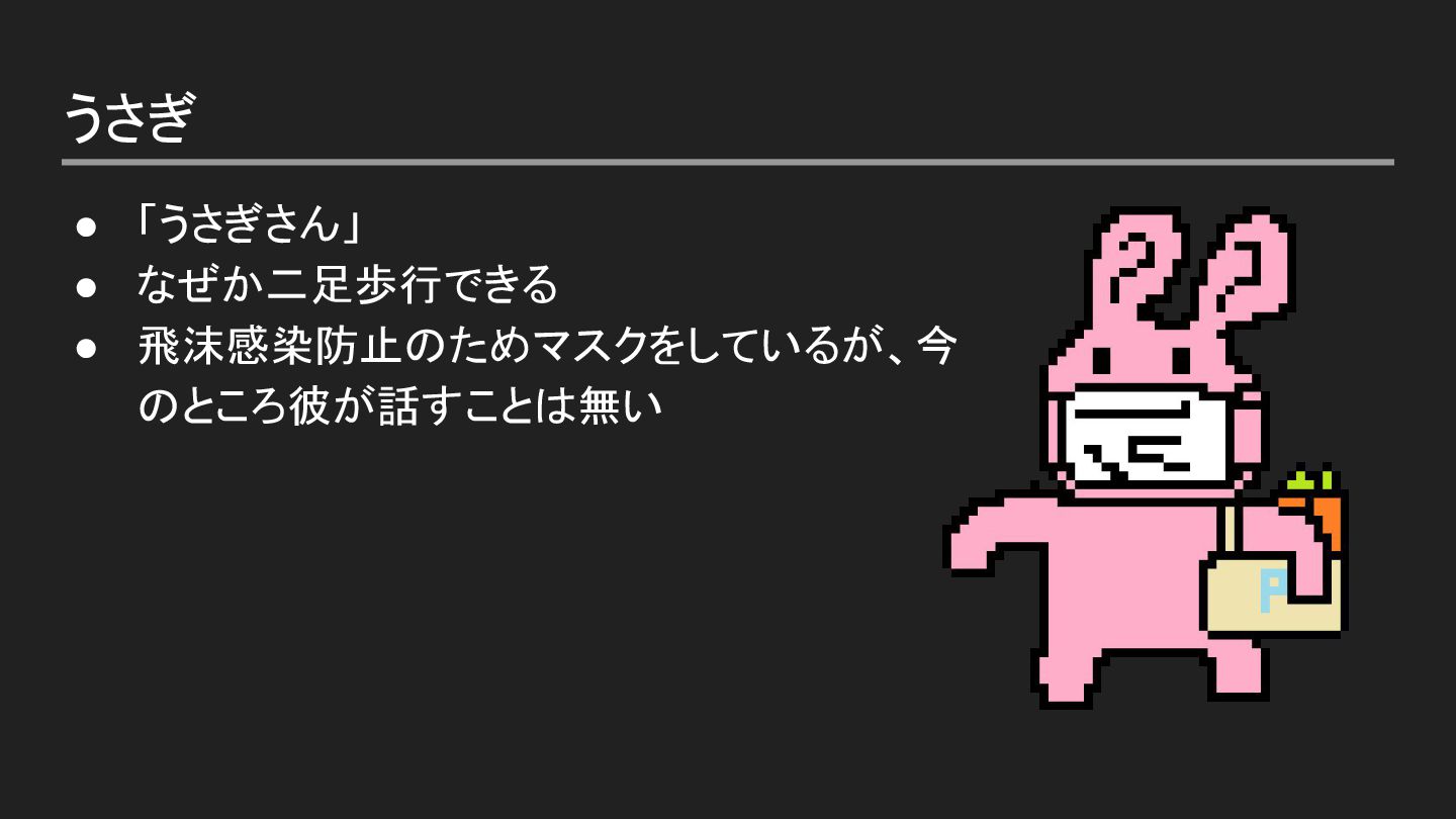 うさぎ • 「うさぎさん」 • なぜか二足歩行できる • 飛沫感染防止のためマスクをしているが、今 のところ彼が話すことは無い