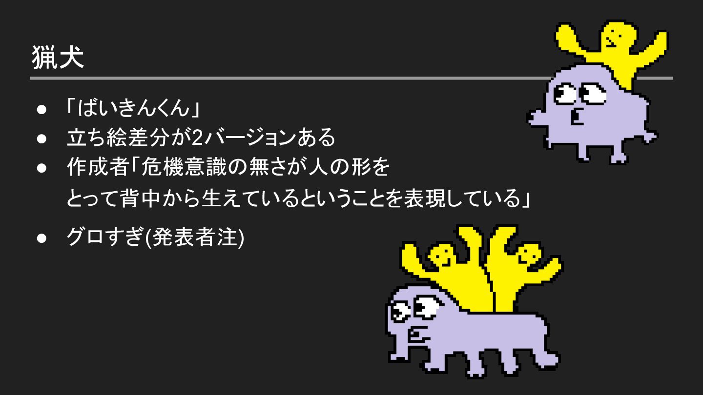 猟犬 • 「ばいきんくん」 • 立ち絵差分が2バージョンある • 作成者「危機意識の無さが人の形を とって背中から生えているということを表現している」 • グロすぎ(発表者注)