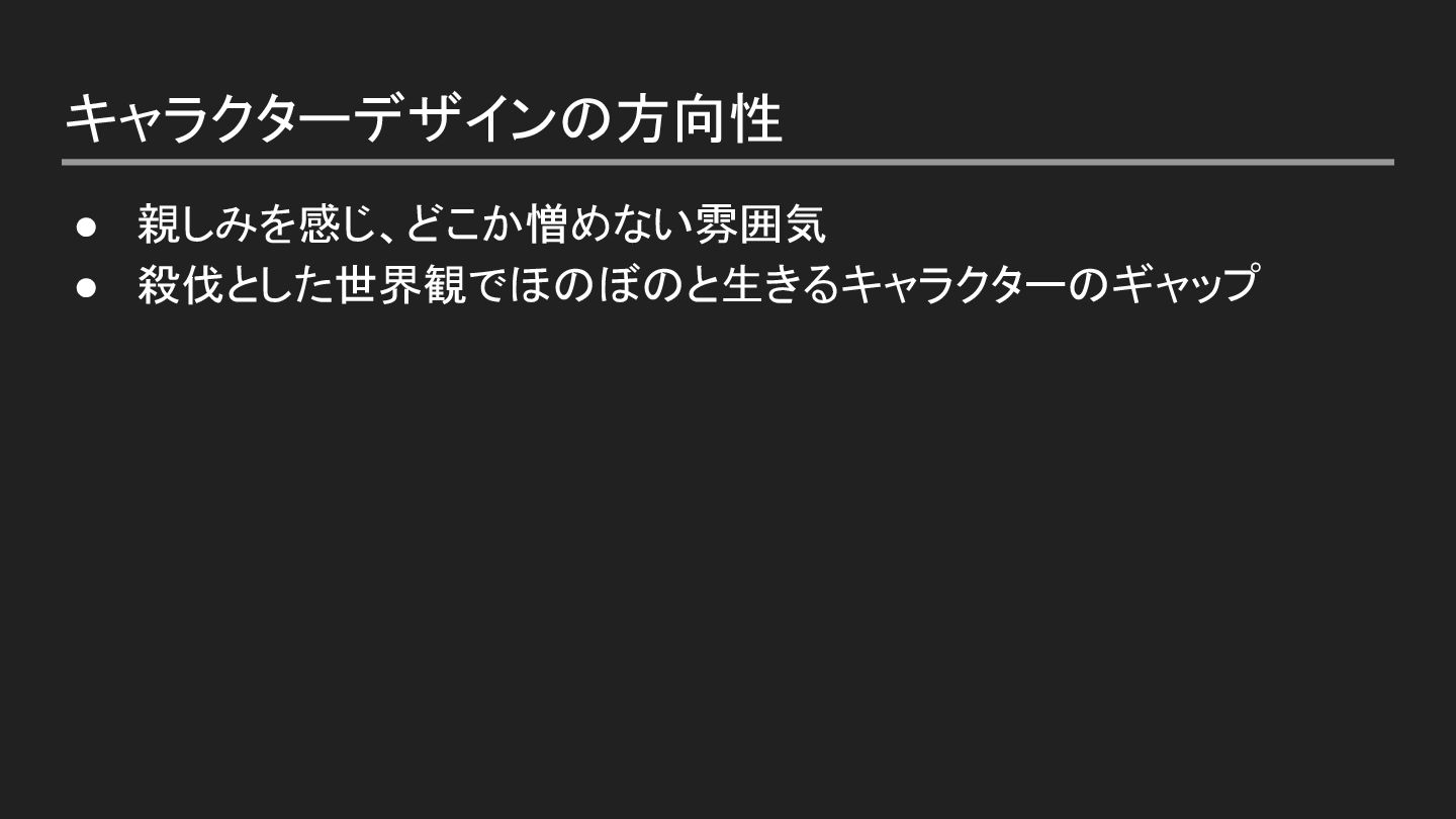 キャラクターデザインの方向性 • 親しみを感じ、どこか憎めない雰囲気 • 殺伐とした世界観でほのぼのと生きるキャラクターのギャップ