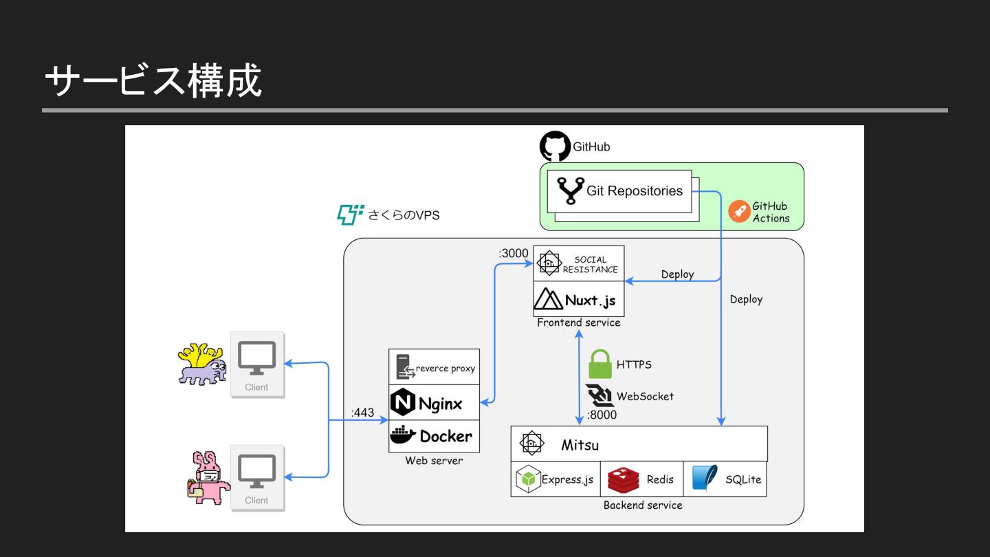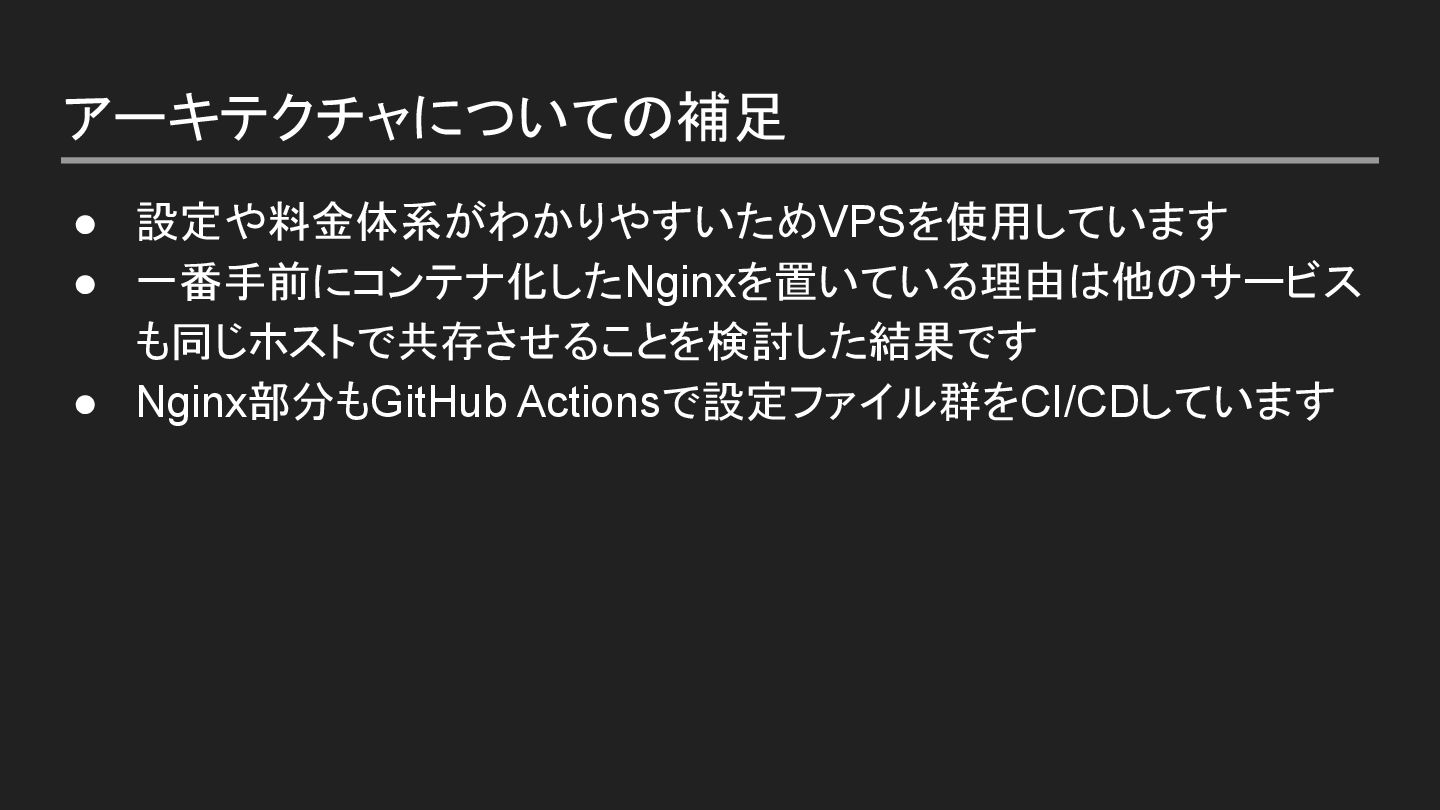 アーキテクチャについての補足 • 設定や料金体系がわかりやすいためVPSを使用しています • 一番手前にコンテナ化したNginxを置いている理由は他のサービス も同じホストで共存させることを検討した結果です • Nginx部分もGitHub Actionsで設定ファイル群をCI/CDしています