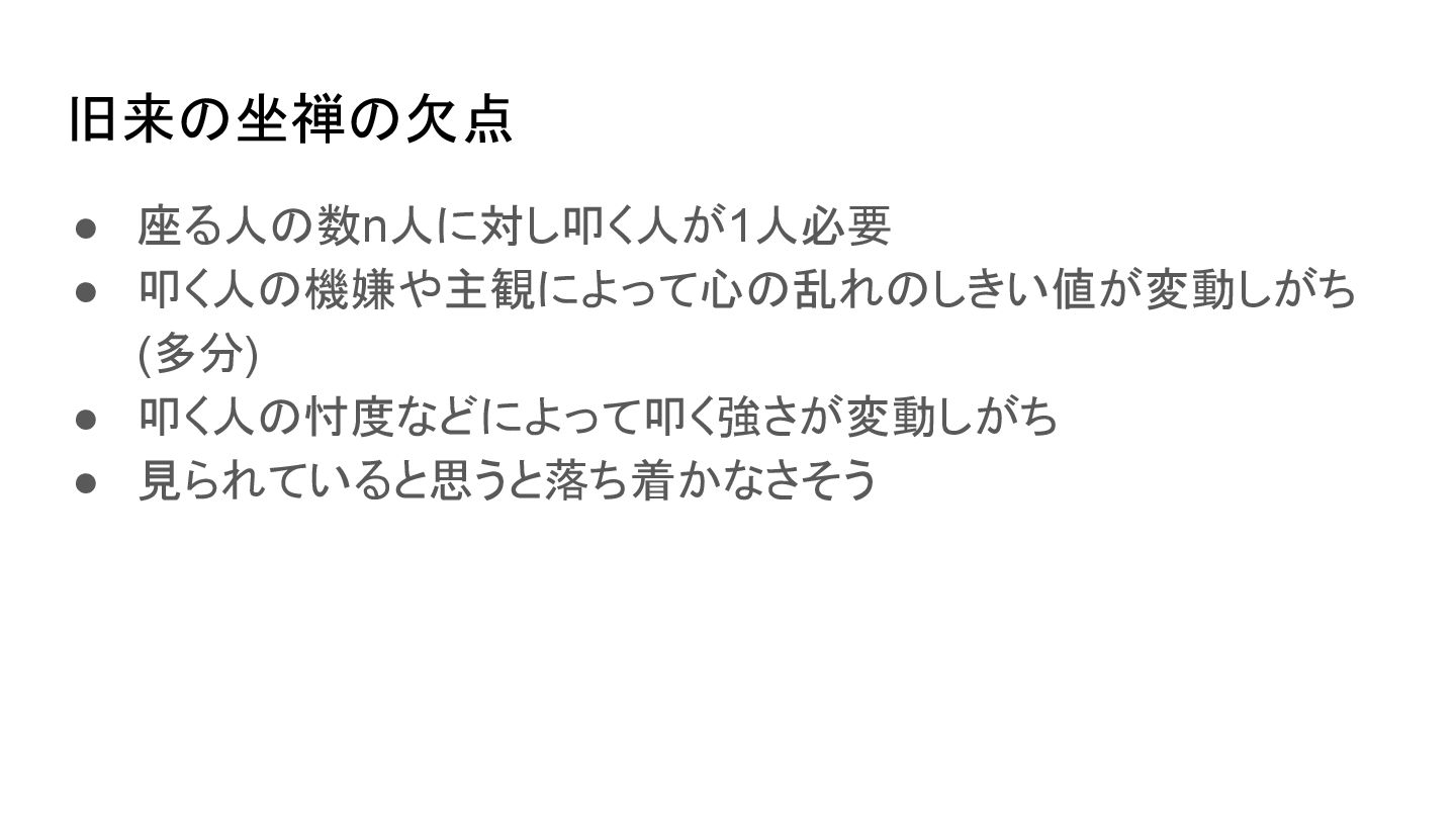 旧来の坐禅の欠点 • 座る人の数n人に対し叩く人が1人必要 • 叩く人の機嫌や主観によって心の乱れのしきい値が変動しがち (多分) • 叩く人の忖度などによって叩く強さが変動しがち • 見られていると思うと落ち着かなさそう