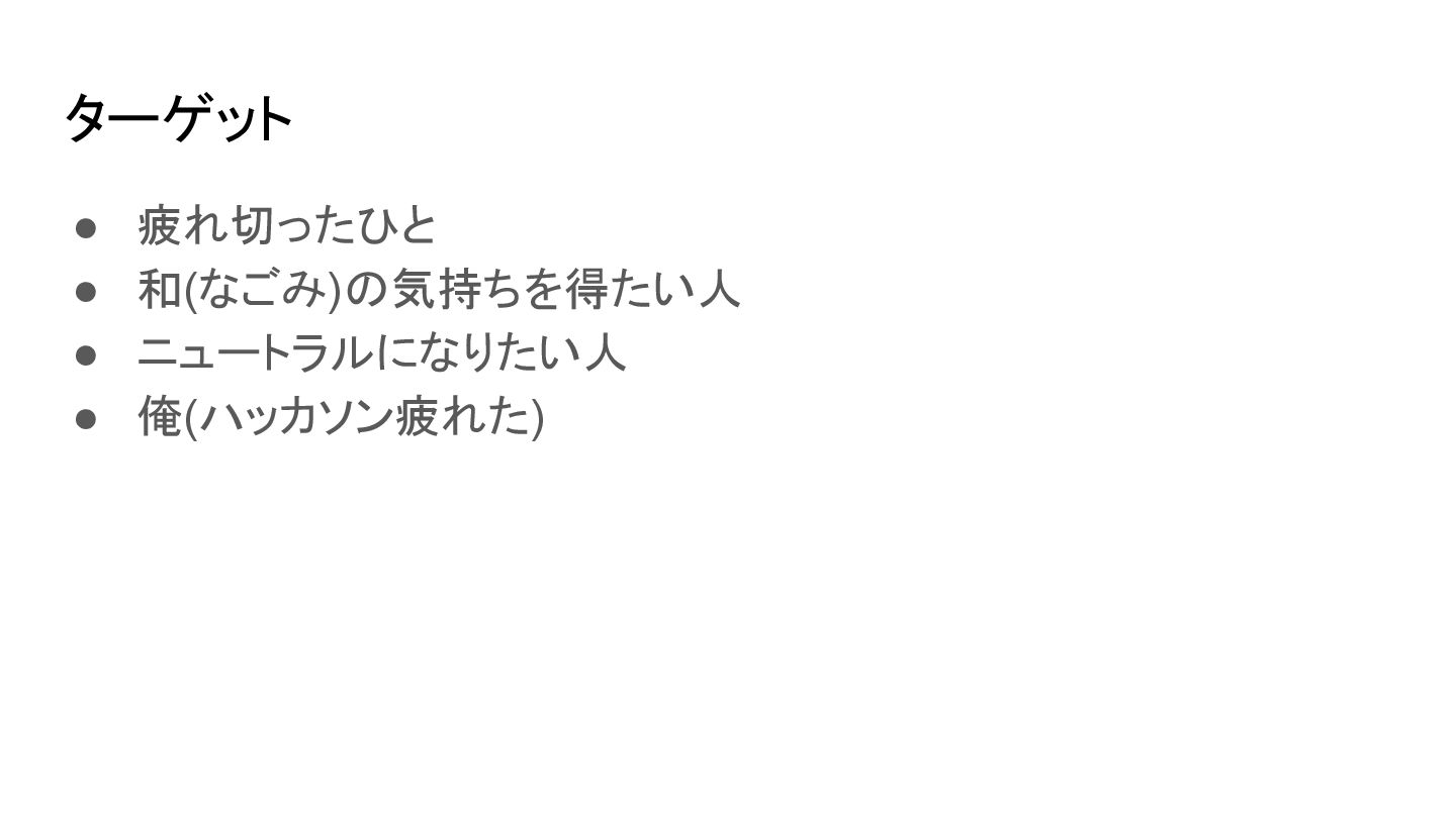 ターゲット • 疲れ切ったひと • 和(なごみ)の気持ちを得たい人 • ニュートラルになりたい人 • 俺(ハッカソン疲れた)