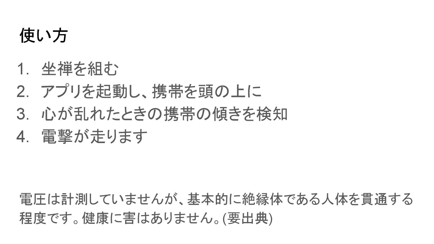 使い方 1. 坐禅を組む 2. アプリを起動し、携帯を頭の上に 3. 心が乱れたときの携帯の傾きを検知 4. 電撃が走ります 電圧は計測していませんが、基本的に絶縁体である人体を貫通する