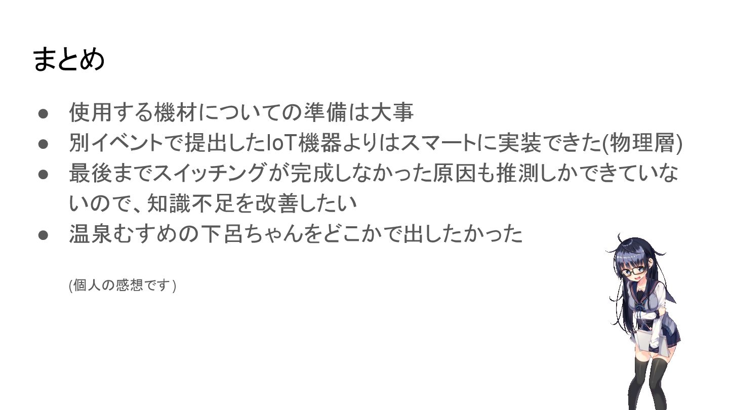 まとめ • 使用する機材についての準備は大事 • 別イベントで提出したIoT機器よりはスマートに実装できた(物理層) • 最後までスイッチングが完成しなかった原因も推測しかできていな いので、知識不足を改善したい • 温泉むすめの下呂ちゃんをどこかで出したかった