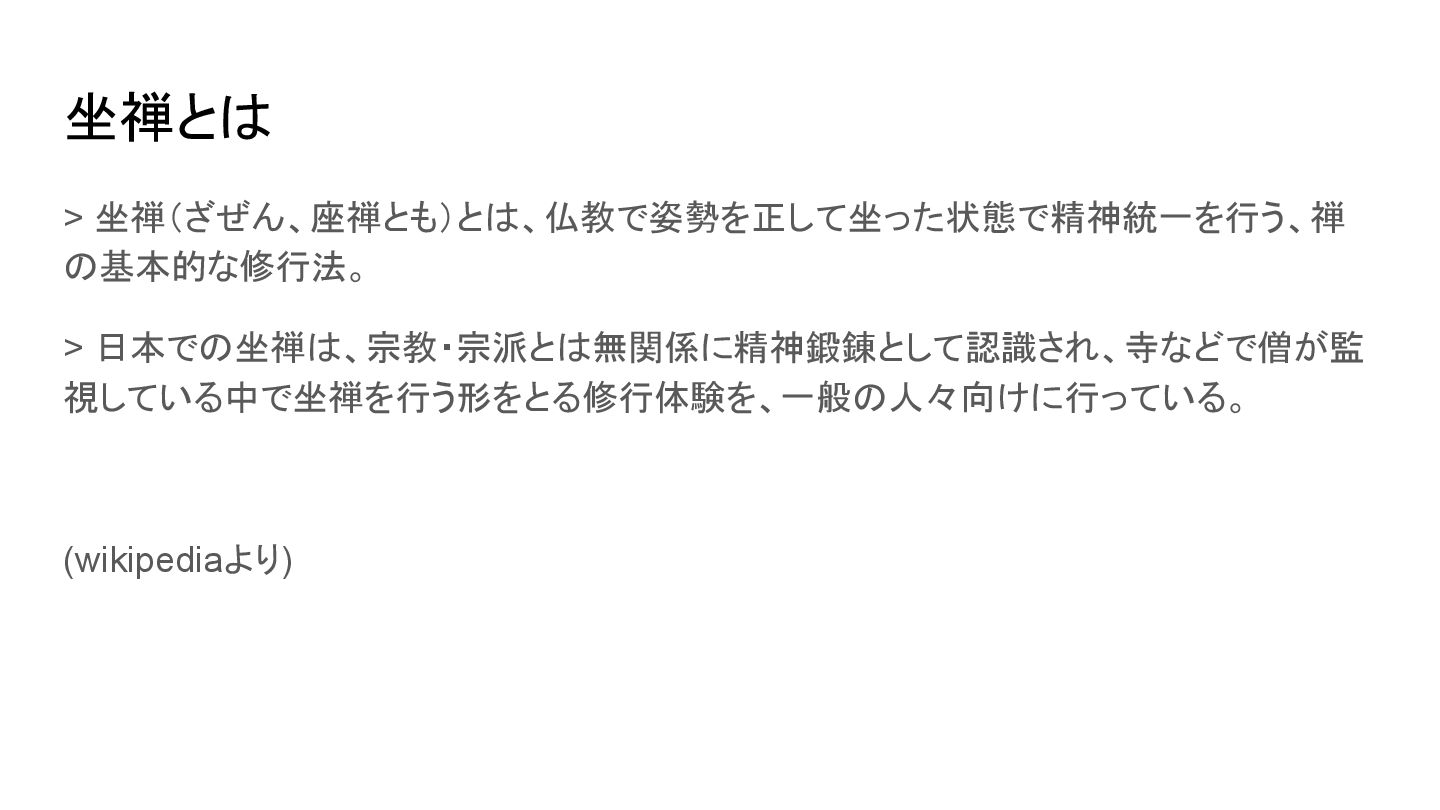 坐禅とは > 坐禅(ざぜん、座禅とも)とは、仏教で姿勢を正して坐った状態で精神統一を行う、禅 の基本的な修行法。 > 日本での坐禅は、宗教・宗派とは無関係に精神鍛錬として認識され、寺などで僧が監 視している中で坐禅を行う形をとる修行体験を、一般の人々向けに行っている。 (wikipediaより)