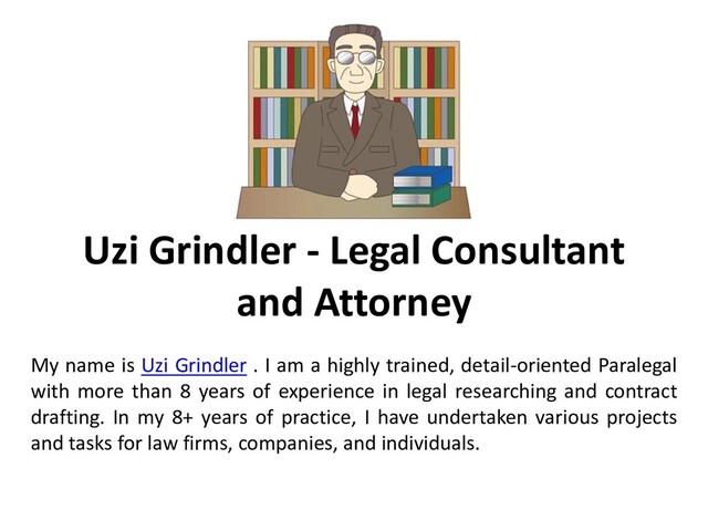 Uzi Grindler is a Legal Consultant and Attorney with extensive experience providing legal work and professional services, including, but not limited to, contracts, licensing, corporate law, corporate governance, negotiations, due diligence, RFP's, bankruptcy, civil litigation, unlawful detainers, discovery, motion practice, etc. Proactive, motivated team player leveraging unique combination of legal knowledge, leadership skills, strong organization skills and business acumen to drive results and grow and fuel success. Demonstrate influential leadership, client relations and advocacy and consensus building to achieve results. Research and analyze rules and regulations and drive high-impact strategies to mitigate risks.