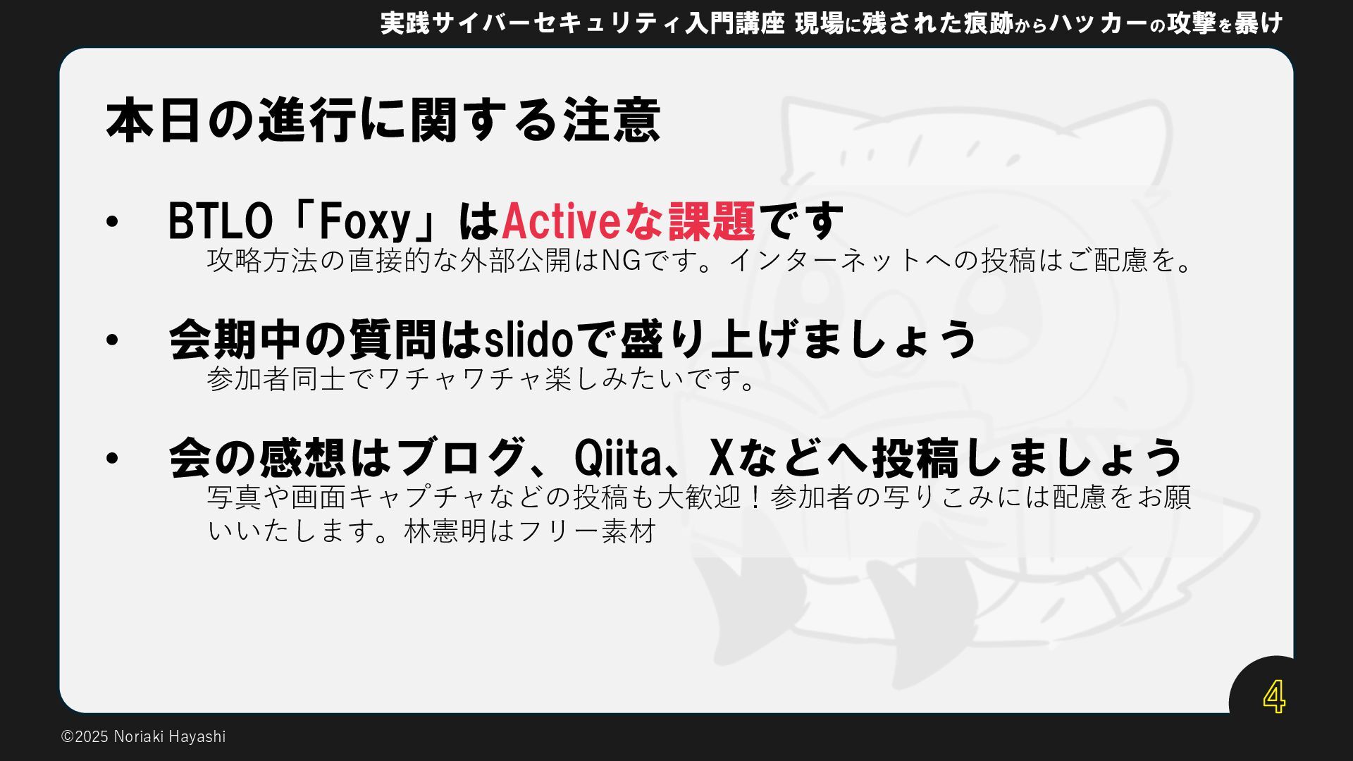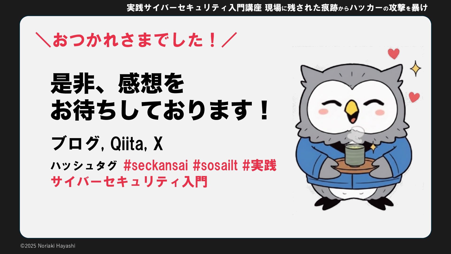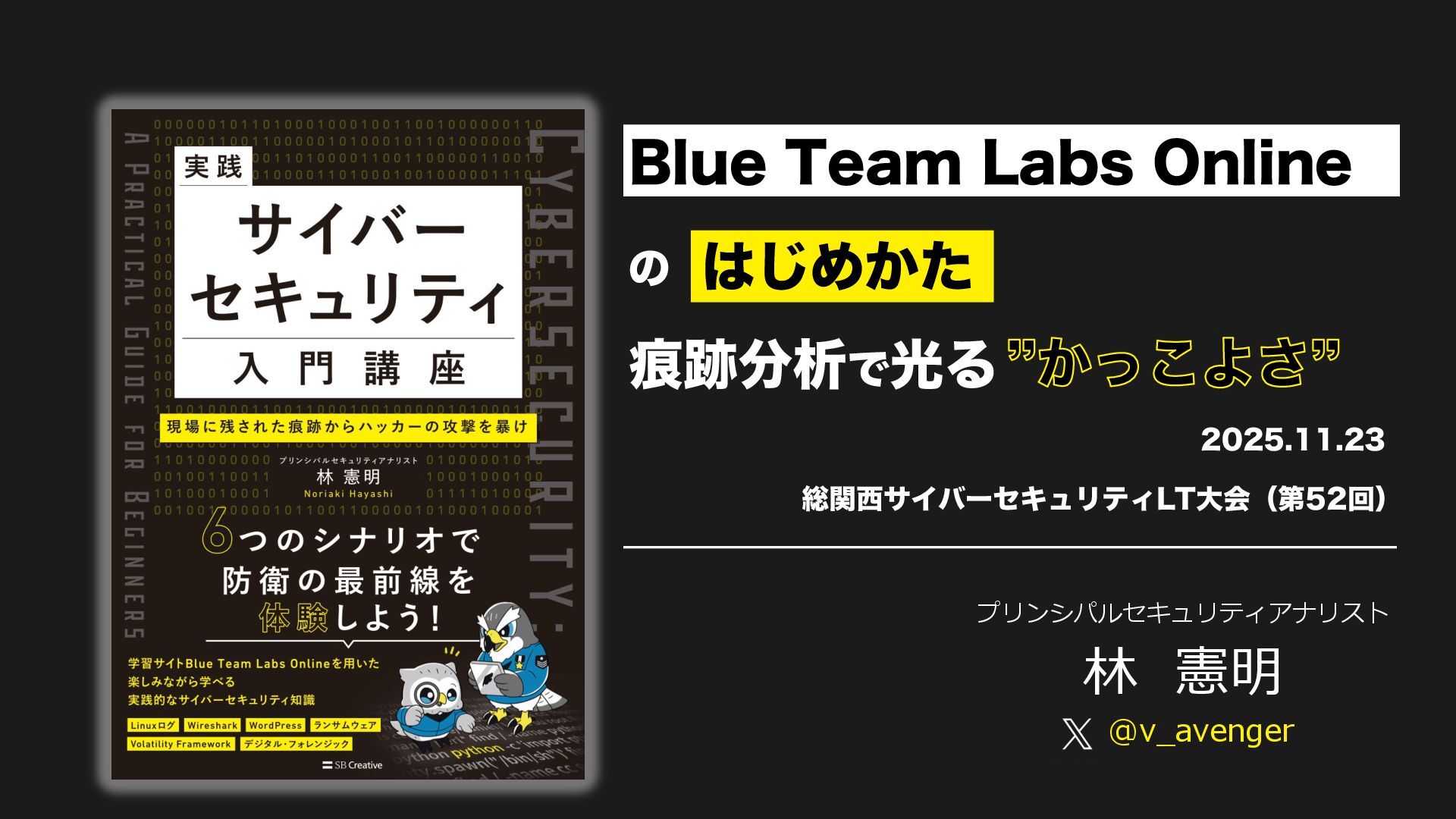 第52回 総関西サイバーセキュリティLT大会 題目:「Blue Team Labs Online」のはじめかた 痕跡分析で光る"かっこよさ" 日時:2025年11月23日(日) URL:https://sec-kansai.connpass.com/event/370268/