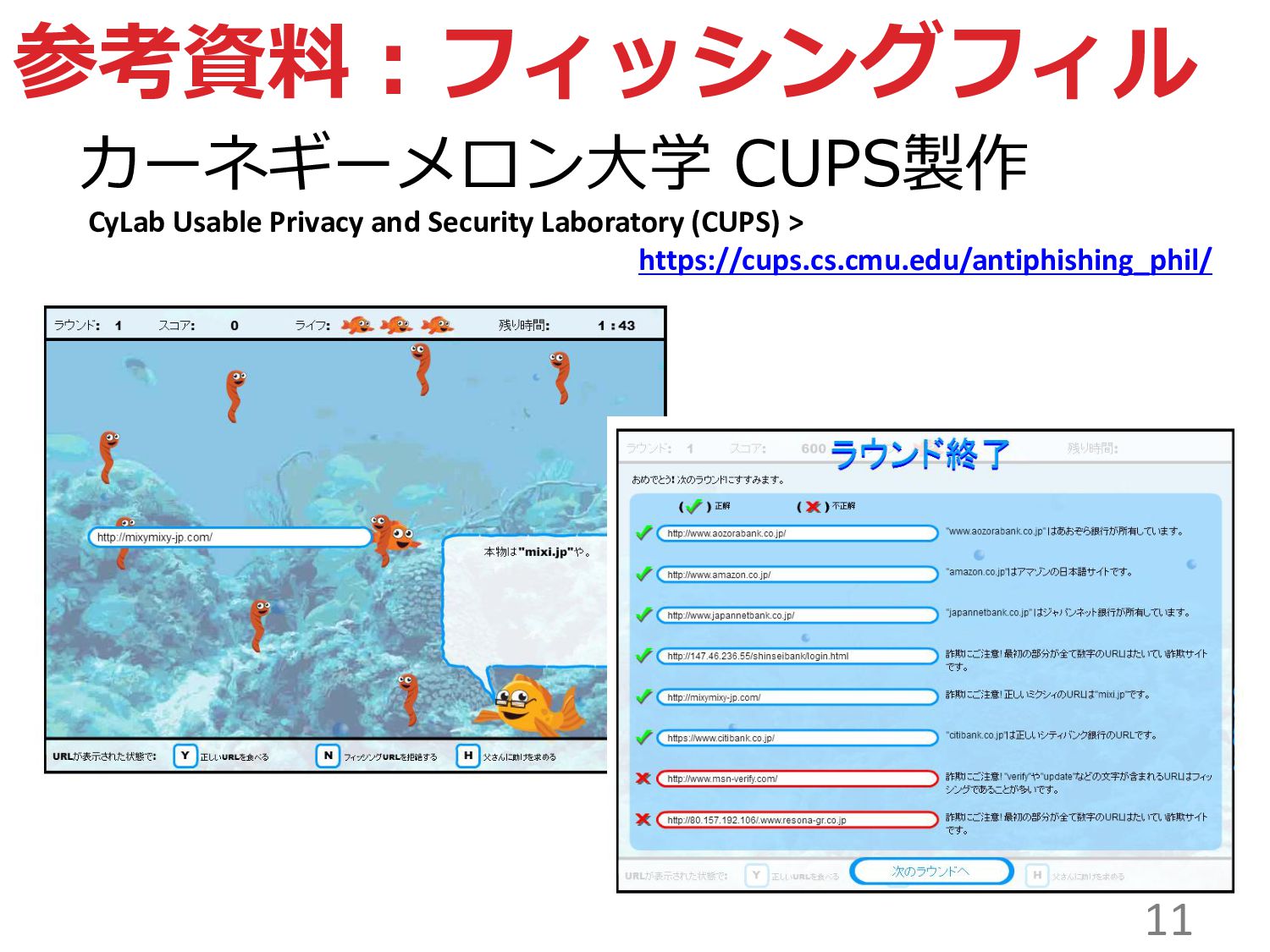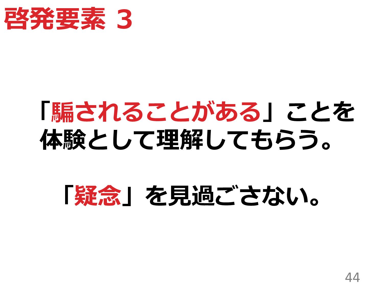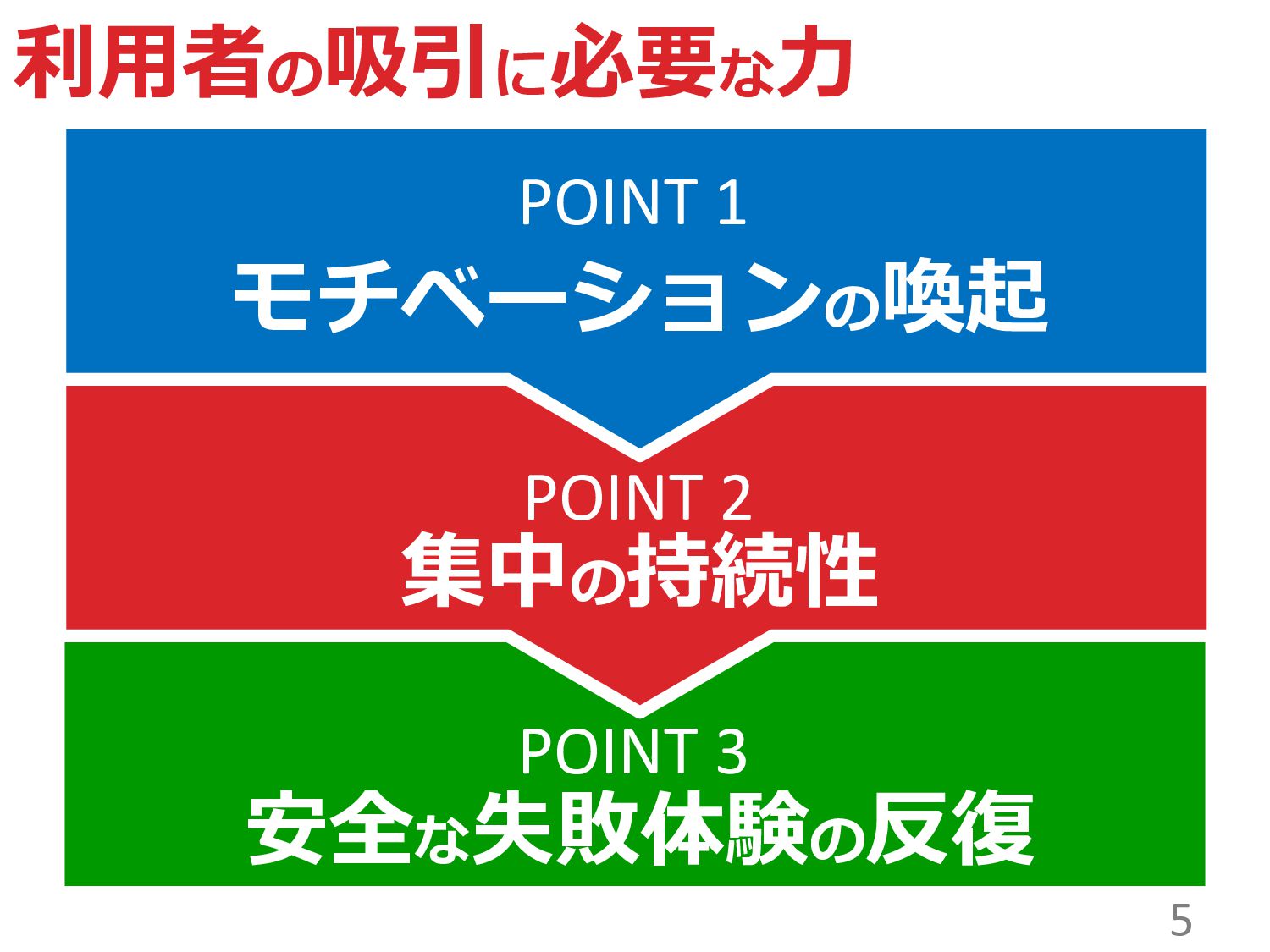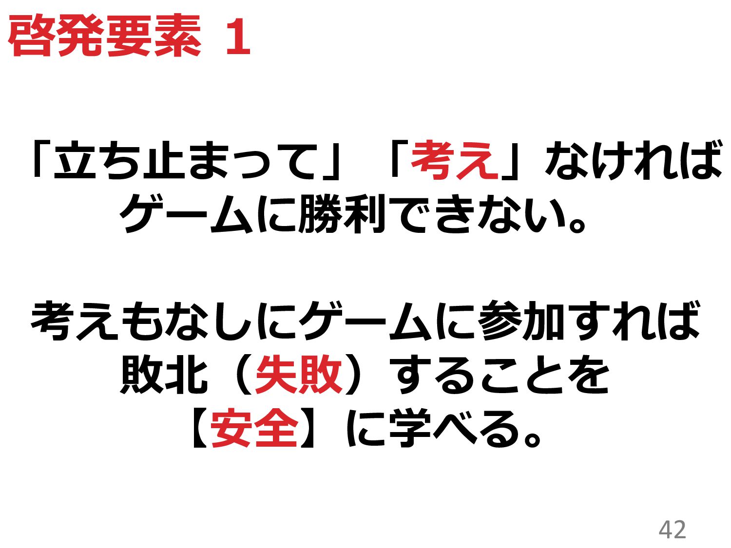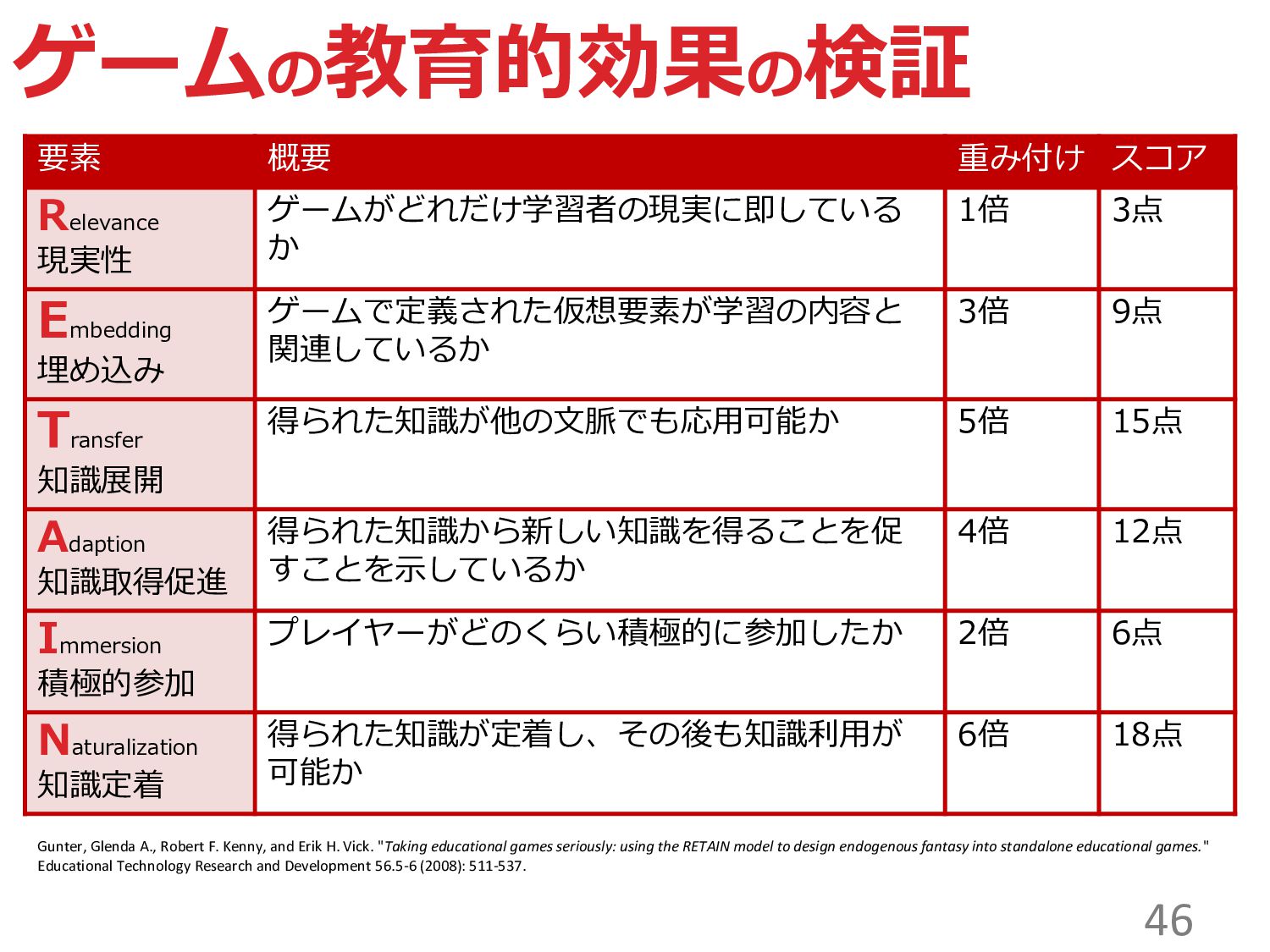1倍 3点 E mbedding 埋め込み ゲームで定義された仮想要素が学習の内容と 関連しているか 3倍 9点 T ransfer 知識展開 得られた知識が他の文脈でも応用可能か 5倍 15点 Adaption 知識取得促進 得られた知識から新しい知識を得ることを促 すことを示しているか 4倍 12点 Immersion 積極的参加 プレヤーがどのくらい積極的に参加したか 2倍 6点 Naturalization 知識定着 得られた知識が定着し、その後も知識利用が 可能か 6倍 18点 Gunter, Glenda A., Robert F. Kenny, and Erik H. Vick. "Taking educational games seriously: using the RETAIN model to design endogenous fantasy into standalone educational games." Educational Technology Research and Development 56.5-6 (2008): 511-537.