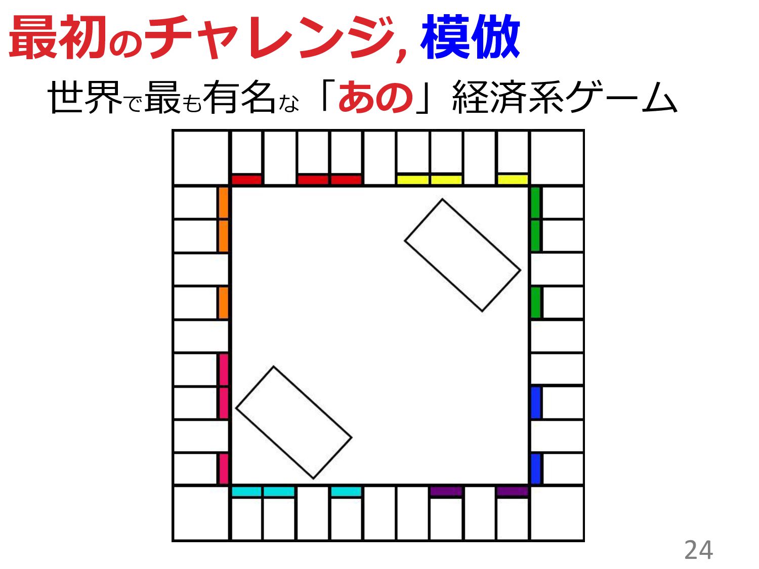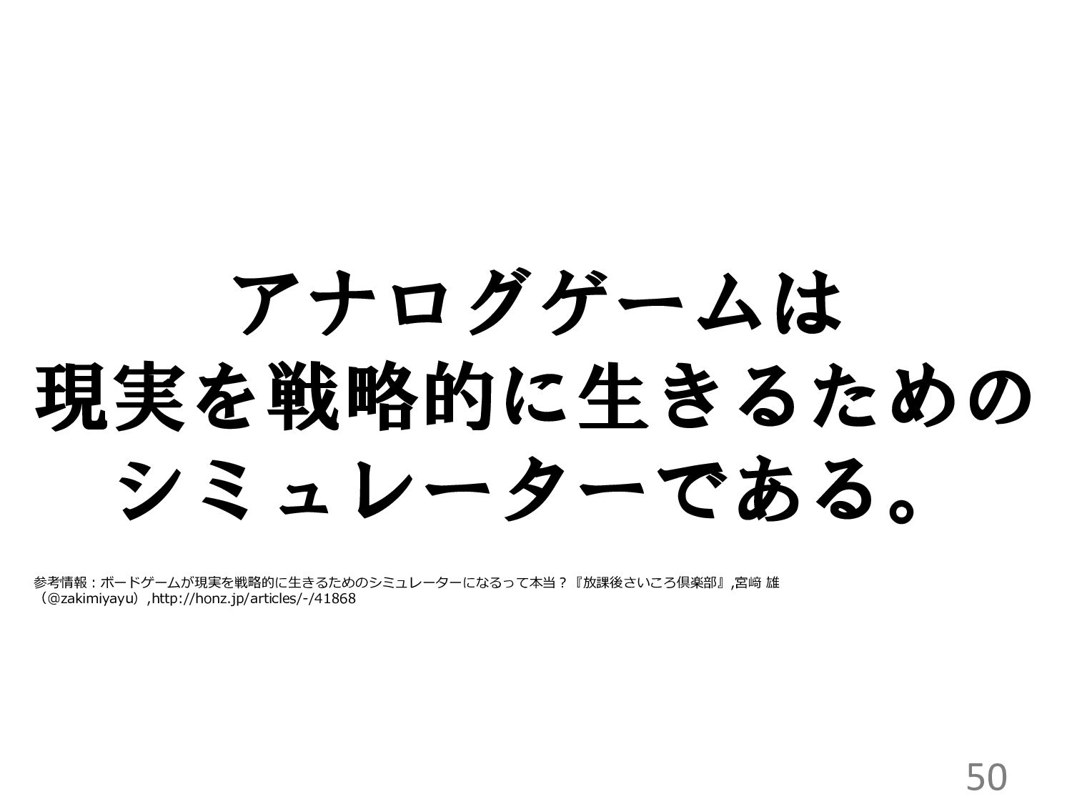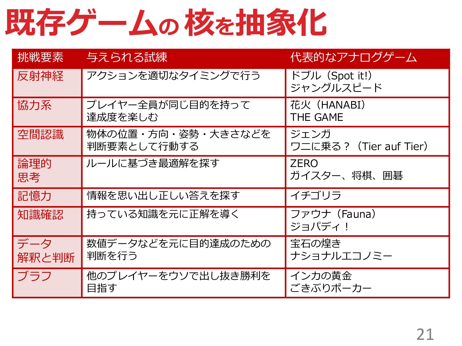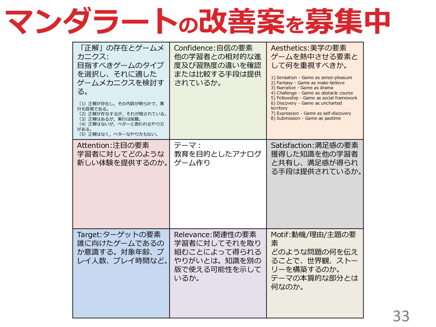 (3)正解はあるが〃実行は困難。 (4)正解はないが〃ベターと思われるやり方 がある。 (5)正解はなく〃ベターなやり方もない。 Confidence:自信の要素 他の学習者との相対的な進 度及び習熟度の違いを確認 または比較する手段は提供 されているか。 Aesthetics:美学の要素 ゲームを熱中させる要素と して何を重視すべきか。 1) Sensation - Game as sense-pleasure 2) Fantasy - Game as make-believe 3) Narrative - Game as drama 4) Challenge - Game as obstacle course 5) Fellowship - Game as social framework 6) Discovery - Game as uncharted territory 7) Expression - Game as self-discovery 8) Submission - Game as pastime Attention:注目の要素 学習者に対してどのような 新しい体験を提供するのか。 テーマ: 教育を目的としたゕナログ ゲーム作り Satisfaction:満足感の要素 獲得した知識を他の学習者 と共有し、満足感が得られ る手段は提供されているか。 Target:ターゲットの要素 誰に向けたゲームであるの か意識する。対象年齢、プ レ人数、プレ時間など。 Relevance:関連性の要素 学習者に対してそれを取り 組むことによって得られる やりがいとは。知識を別の 版で使える可能性を示して いるか。 Motif:動機/理由/主題の要 素 どのような問題の何を伝え ることで、世界観、ストー リーを構築するのか。 テーマの本質的な部分とは 何なのか。 マンダラートの改善案を募集中