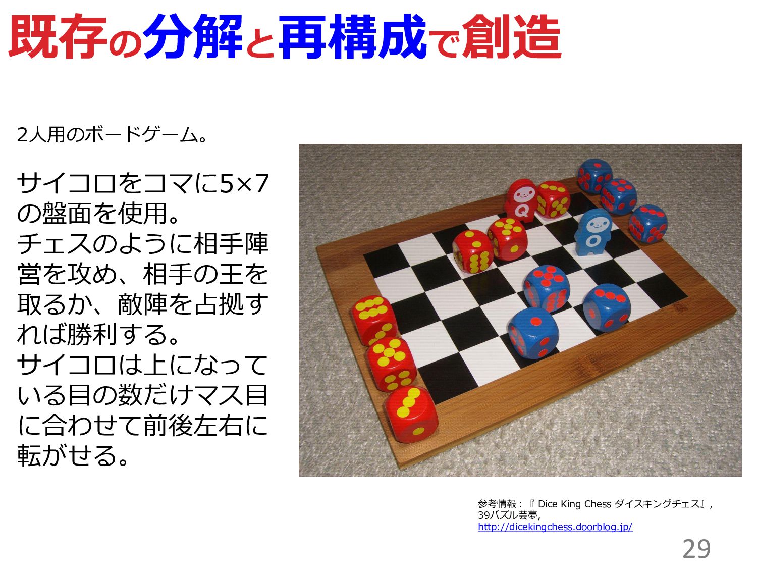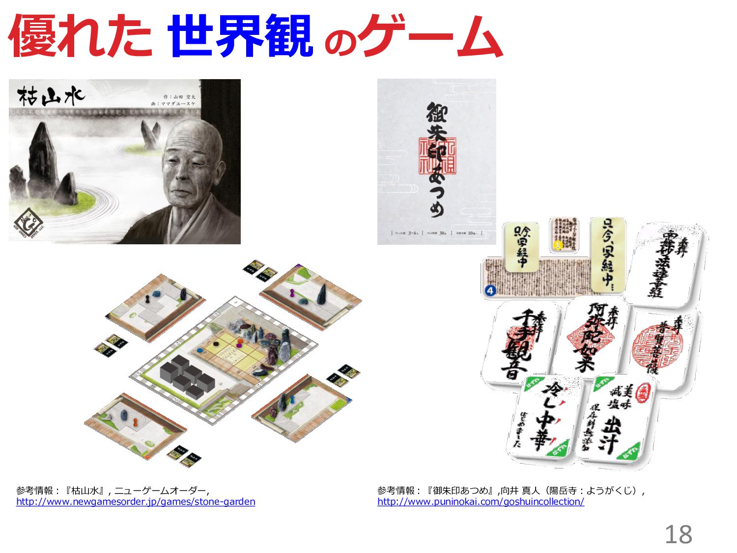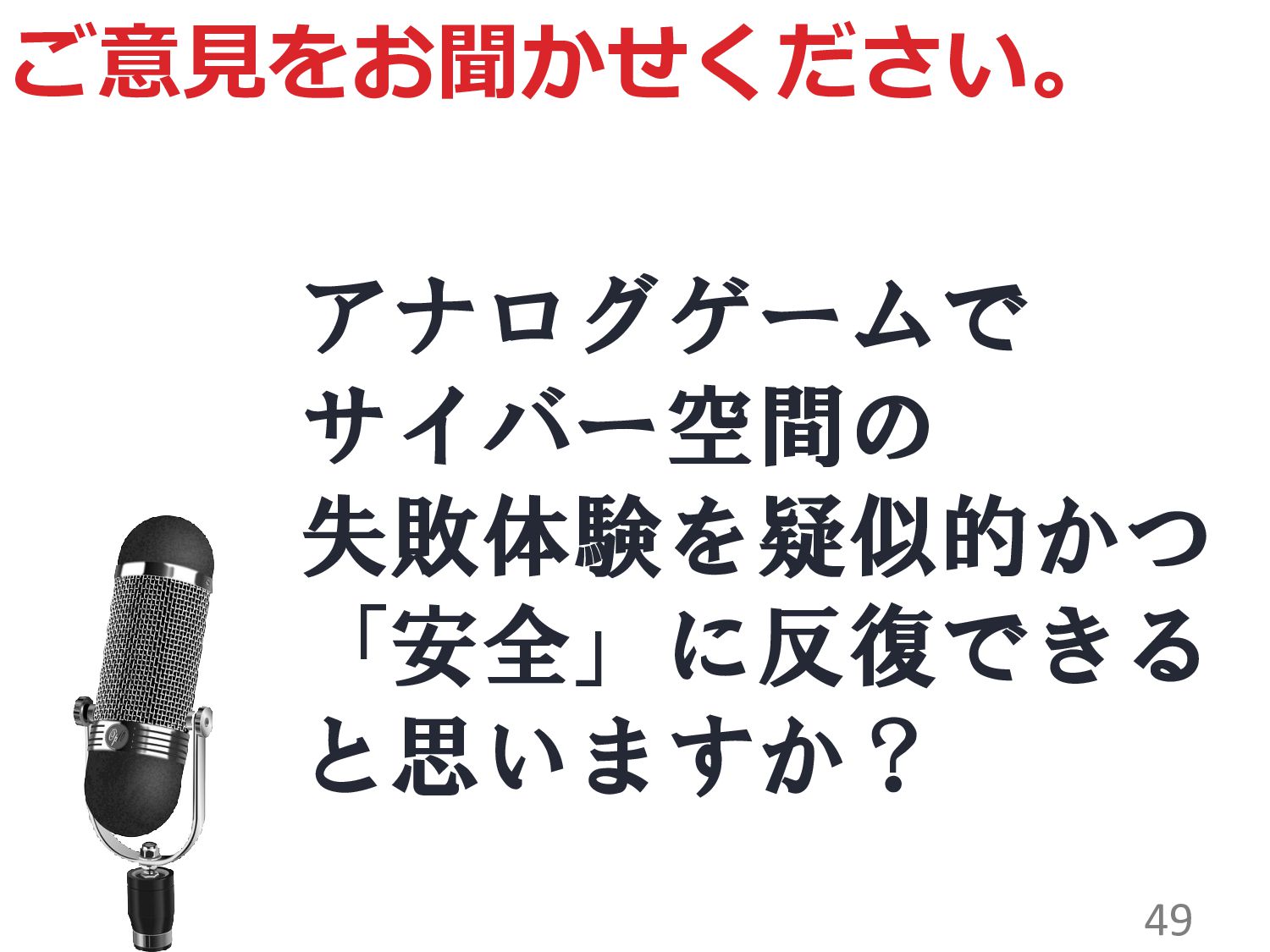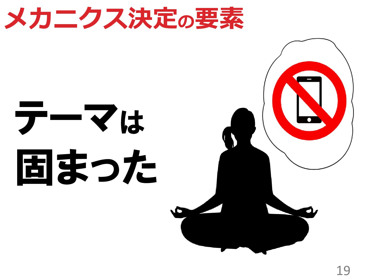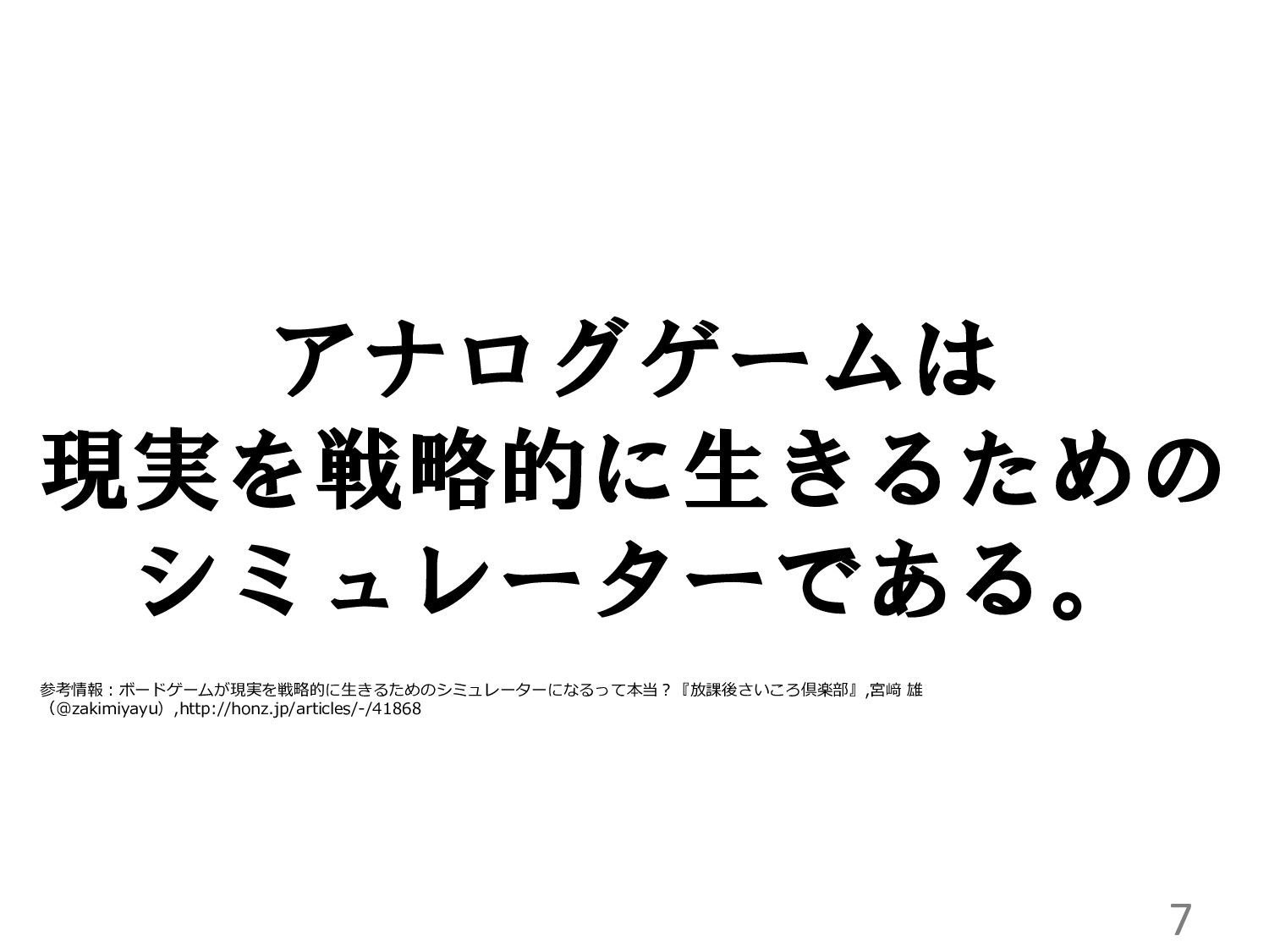 (3)正解はあるが〃実行は困難。 (4)正解はないが〃ベターと思われるやり方 がある。 (5)正解はなく〃ベターなやり方もない。 Confidence:自信の要素 他の学習者との相対的な進 度及び習熟度の違いを確認 または比較する手段は提供 されているか。 Aesthetics:美学の要素 ゲームを熱中させる要素と して何を重視すべきか。 1) Sensation - Game as sense-pleasure 2) Fantasy - Game as make-believe 3) Narrative - Game as drama 4) Challenge - Game as obstacle course 5) Fellowship - Game as social framework 6) Discovery - Game as uncharted territory 7) Expression - Game as self-discovery 8) Submission - Game as pastime Attention:注目の要素 学習者に対してどのような 新しい体験を提供するのか。 テーマ: 教育を目的としたゕナログ ゲーム作り Satisfaction:満足感の要素 獲得した知識を他の学習者 と共有し、満足感が得られ る手段は提供されているか。 Target:ターゲットの要素 誰に向けたゲームであるの か意識する。対象年齢、プ レ人数、プレ時間など。 Relevance:関連性の要素 学習者に対してそれを取り 組むことによって得られる やりがいとは。知識を別の 版で使える可能性を示して いるか。 Motif:動機/理由/主題の要 素 どのような問題の何を伝え ることで、世界観、ストー リーを構築するのか。 テーマの本質的な部分とは 何なのか。 マンダラートの改善案を募集中