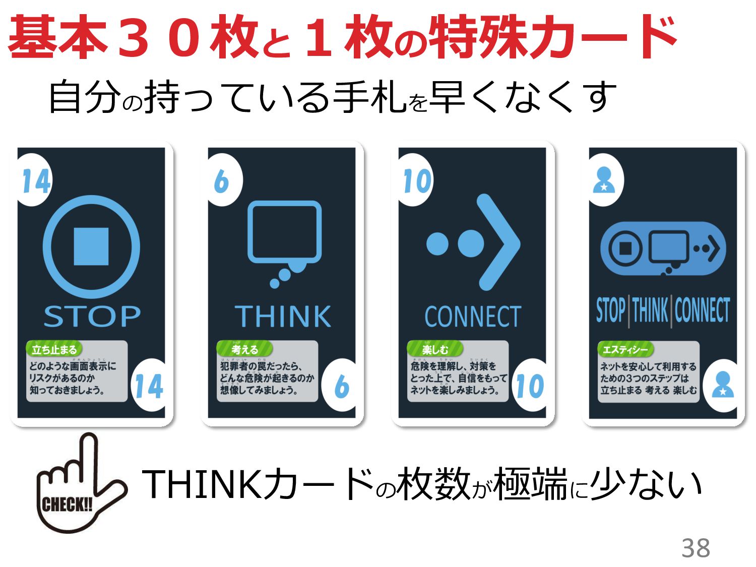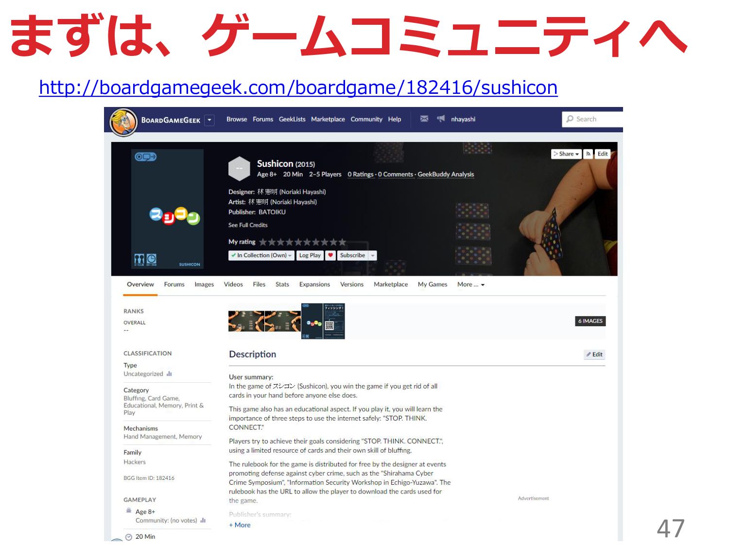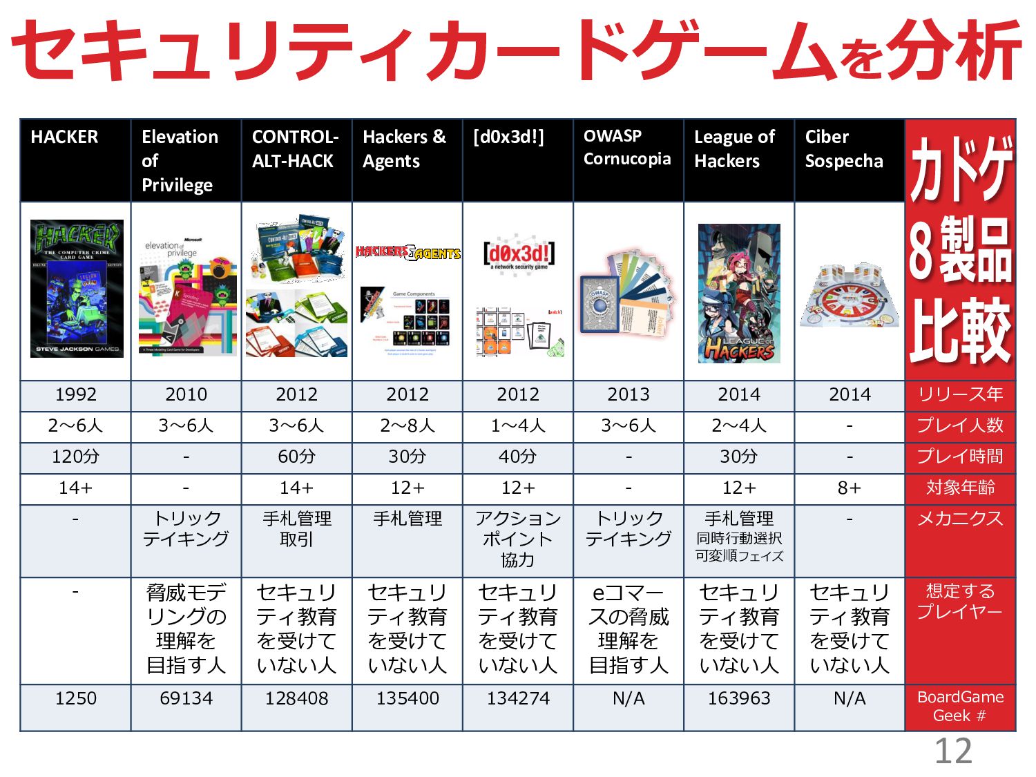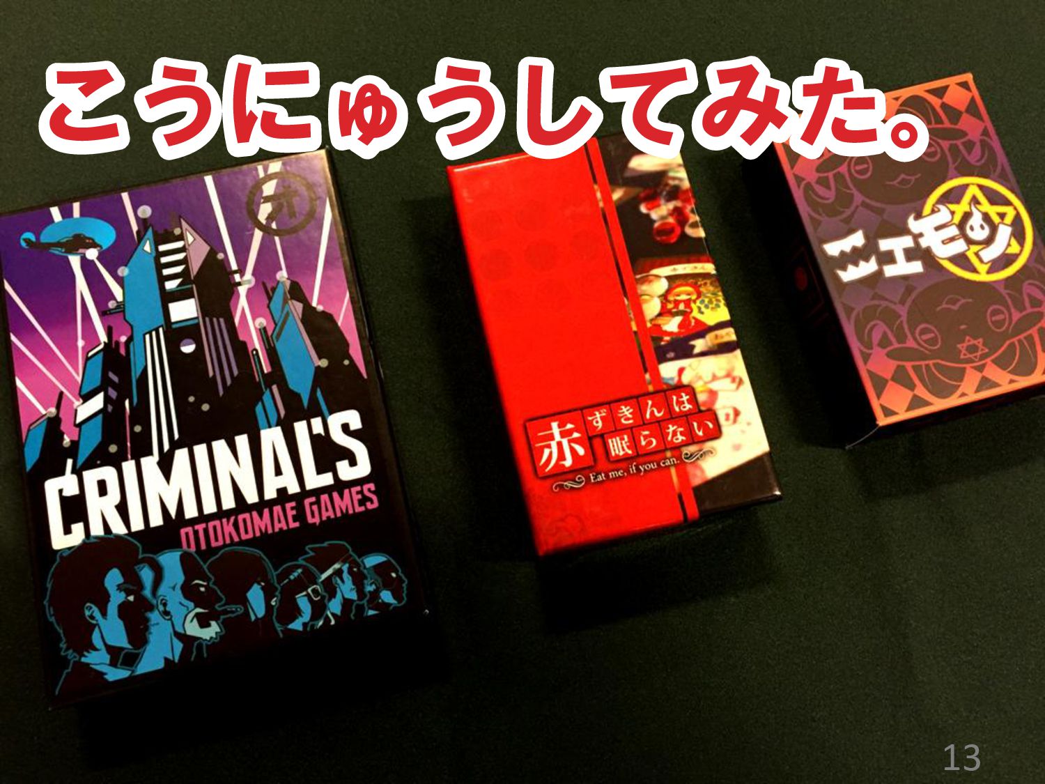 (3)正解はあるが〃実行は困難。 (4)正解はないが〃ベターと思われるやり方 がある。 (5)正解はなく〃ベターなやり方もない。 Confidence:自信の要素 他の学習者との相対的な進 度及び習熟度の違いを確認 または比較する手段は提供 されているか。 Aesthetics:美学の要素 ゲームを熱中させる要素と して何を重視すべきか。 1) Sensation - Game as sense-pleasure 2) Fantasy - Game as make-believe 3) Narrative - Game as drama 4) Challenge - Game as obstacle course 5) Fellowship - Game as social framework 6) Discovery - Game as uncharted territory 7) Expression - Game as self-discovery 8) Submission - Game as pastime Attention:注目の要素 学習者に対してどのような 新しい体験を提供するのか。 テーマ: 教育を目的としたゕナログ ゲーム作り Satisfaction:満足感の要素 獲得した知識を他の学習者 と共有し、満足感が得られ る手段は提供されているか。 Target:ターゲットの要素 誰に向けたゲームであるの か意識する。対象年齢、プ レ人数、プレ時間など。 Relevance:関連性の要素 学習者に対してそれを取り 組むことによって得られる やりがいとは。知識を別の 版で使える可能性を示して いるか。 Motif:動機/理由/主題の要 素 どのような問題の何を伝え ることで、世界観、ストー リーを構築するのか。 テーマの本質的な部分とは 何なのか。 マンダラートの改善案を募集中