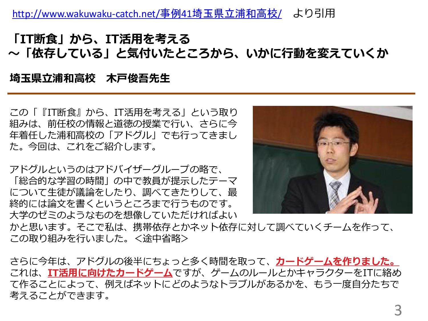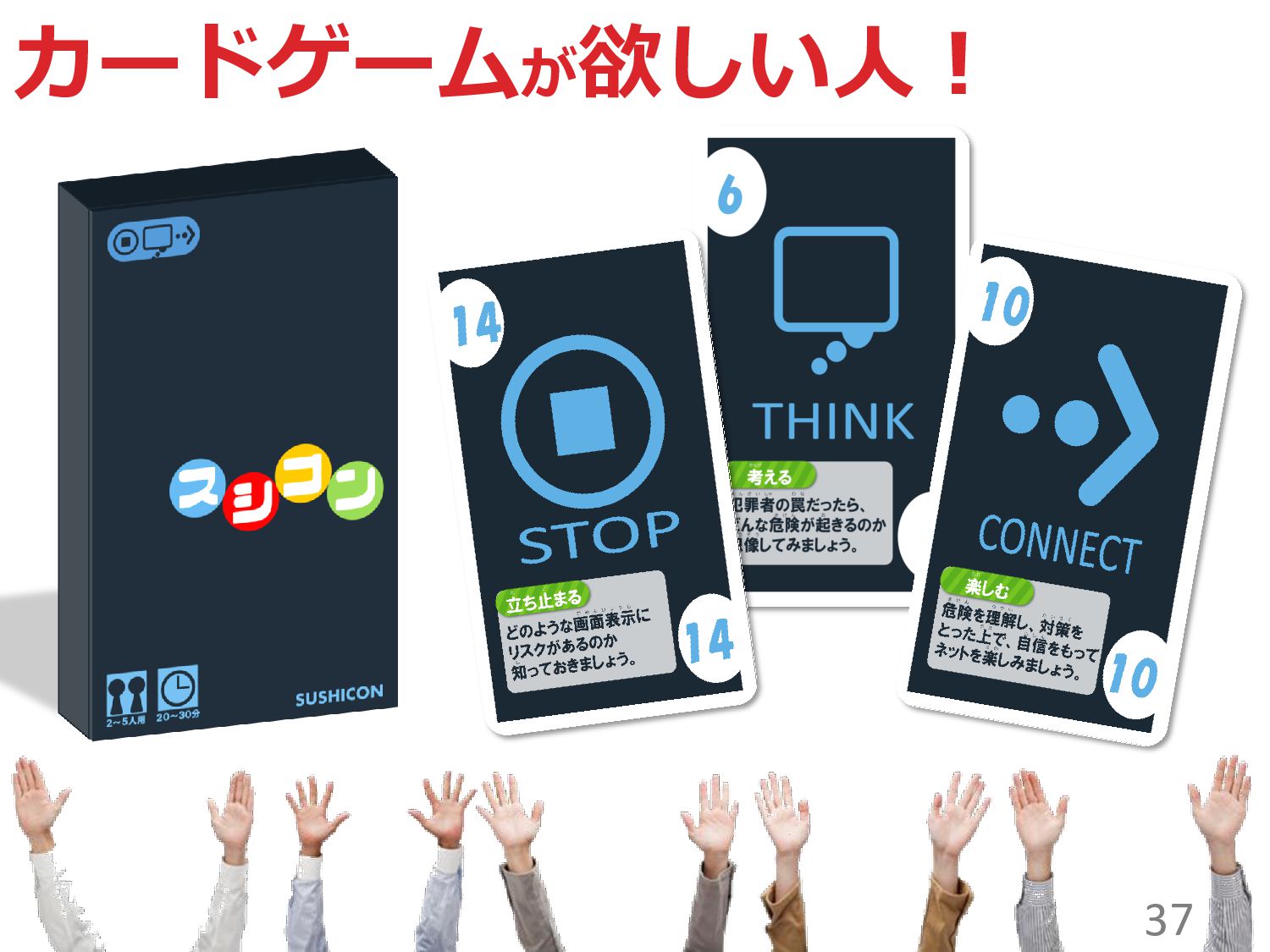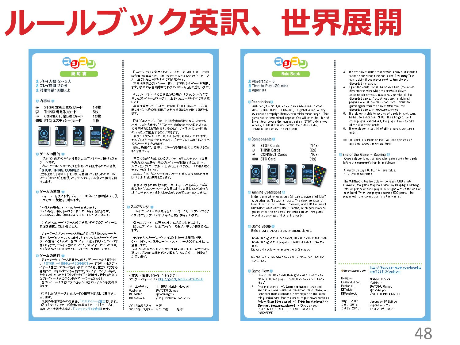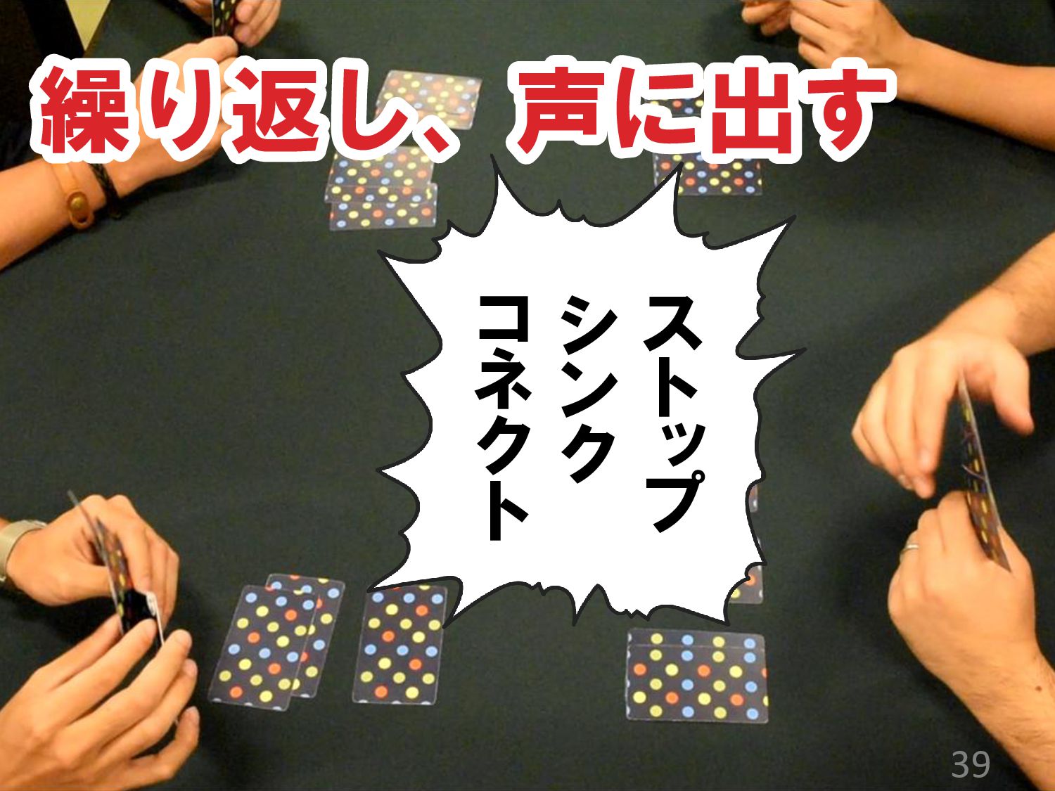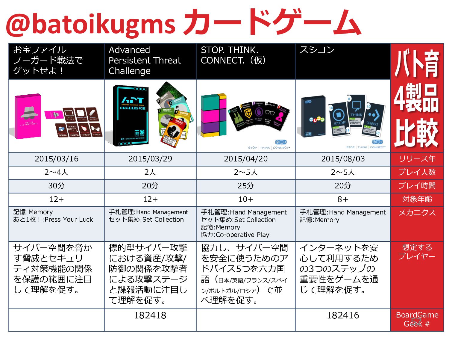 (3)正解はあるが〃実行は困難。 (4)正解はないが〃ベターと思われるやり方 がある。 (5)正解はなく〃ベターなやり方もない。 Confidence:自信の要素 他の学習者との相対的な進 度及び習熟度の違いを確認 または比較する手段は提供 されているか。 Aesthetics:美学の要素 ゲームを熱中させる要素と して何を重視すべきか。 1) Sensation - Game as sense-pleasure 2) Fantasy - Game as make-believe 3) Narrative - Game as drama 4) Challenge - Game as obstacle course 5) Fellowship - Game as social framework 6) Discovery - Game as uncharted territory 7) Expression - Game as self-discovery 8) Submission - Game as pastime Attention:注目の要素 学習者に対してどのような 新しい体験を提供するのか。 テーマ: 教育を目的としたゕナログ ゲーム作り Satisfaction:満足感の要素 獲得した知識を他の学習者 と共有し、満足感が得られ る手段は提供されているか。 Target:ターゲットの要素 誰に向けたゲームであるの か意識する。対象年齢、プ レ人数、プレ時間など。 Relevance:関連性の要素 学習者に対してそれを取り 組むことによって得られる やりがいとは。知識を別の 版で使える可能性を示して いるか。 Motif:動機/理由/主題の要 素 どのような問題の何を伝え ることで、世界観、ストー リーを構築するのか。 テーマの本質的な部分とは 何なのか。 マンダラートの改善案を募集中