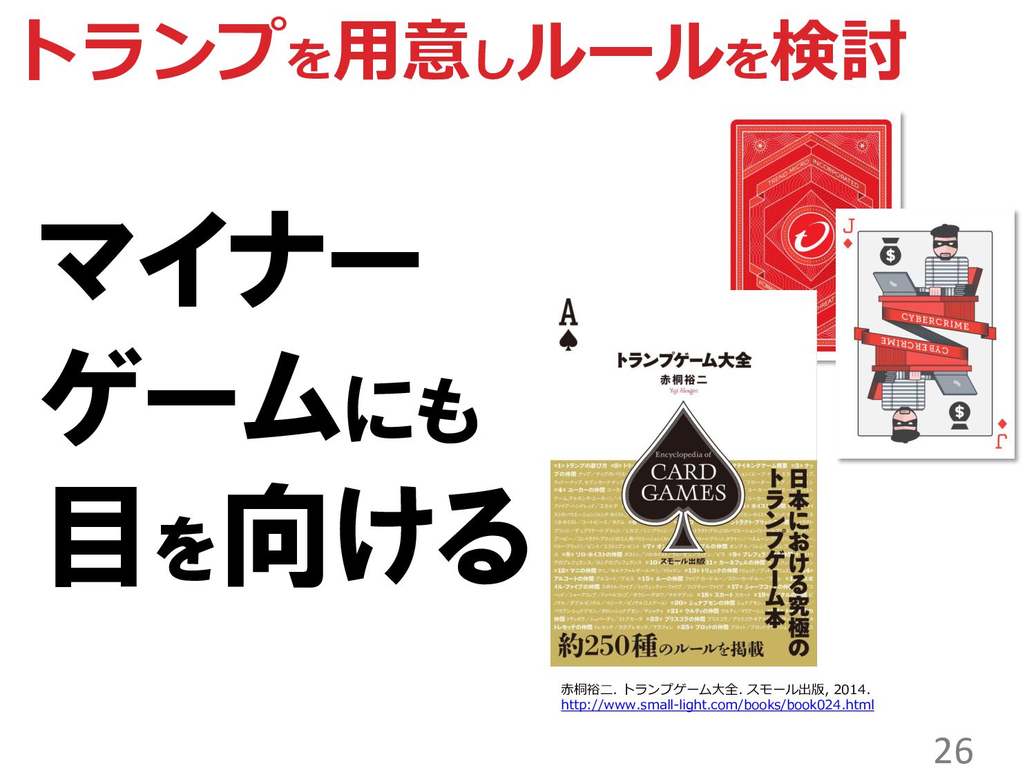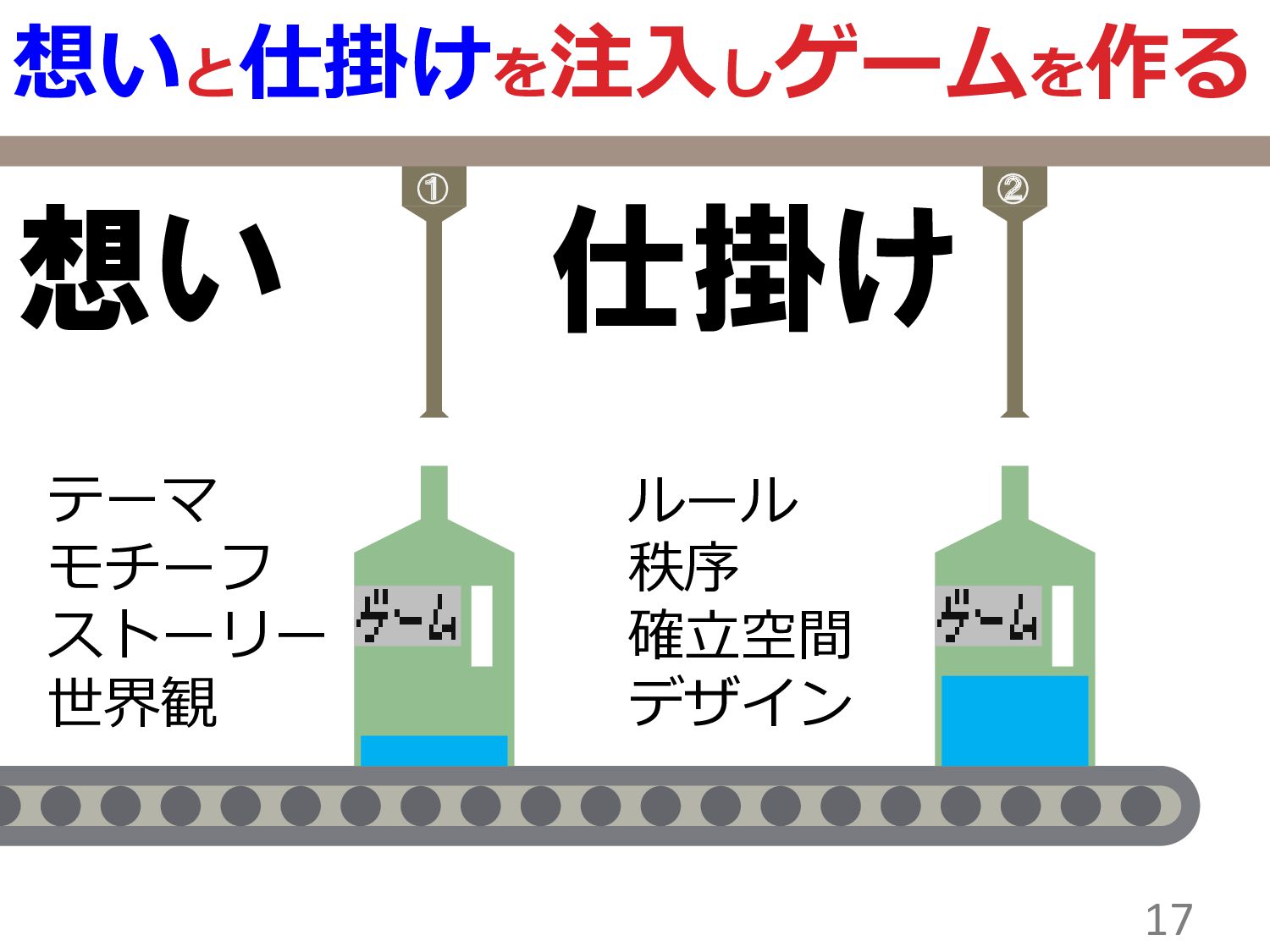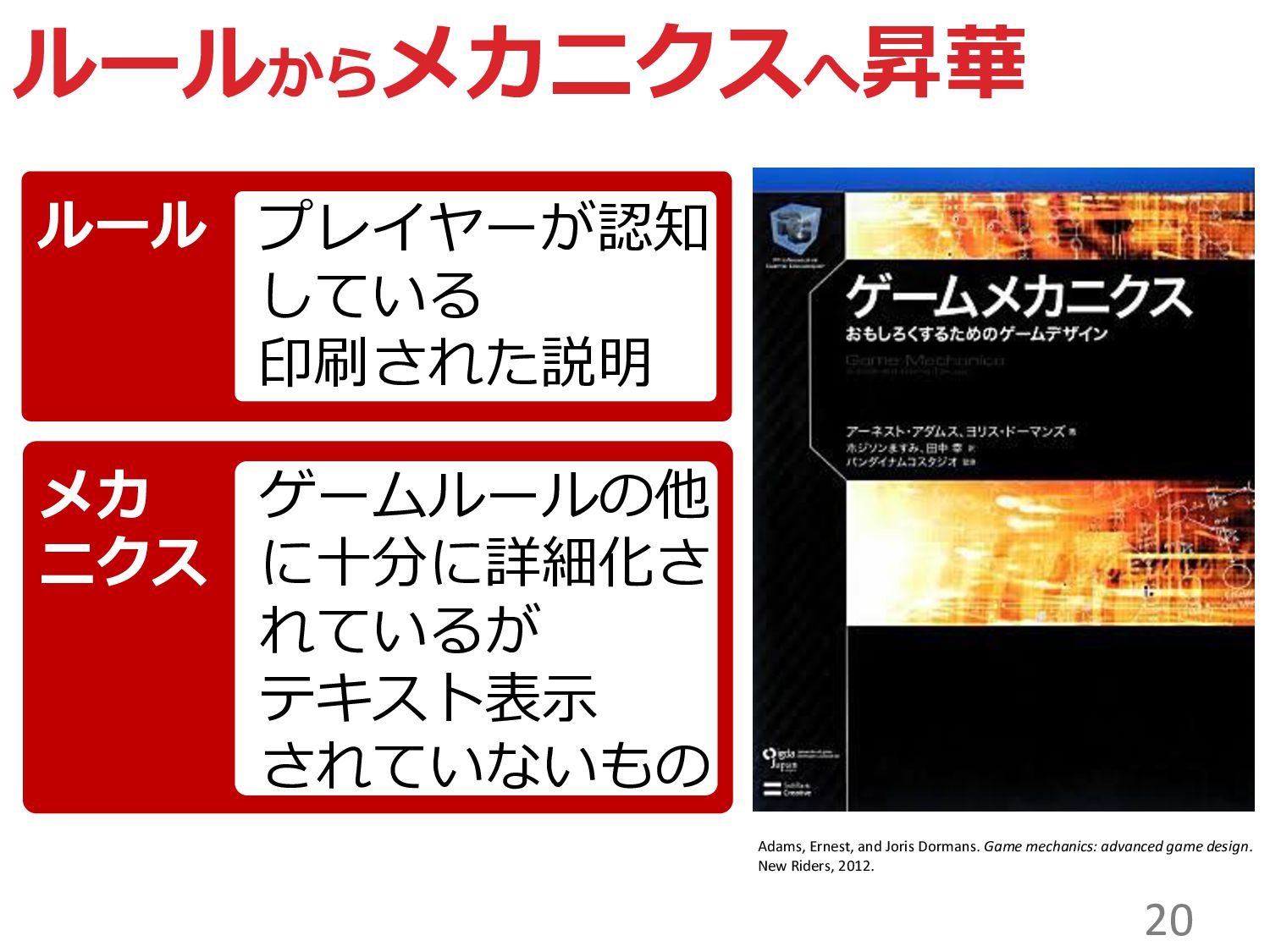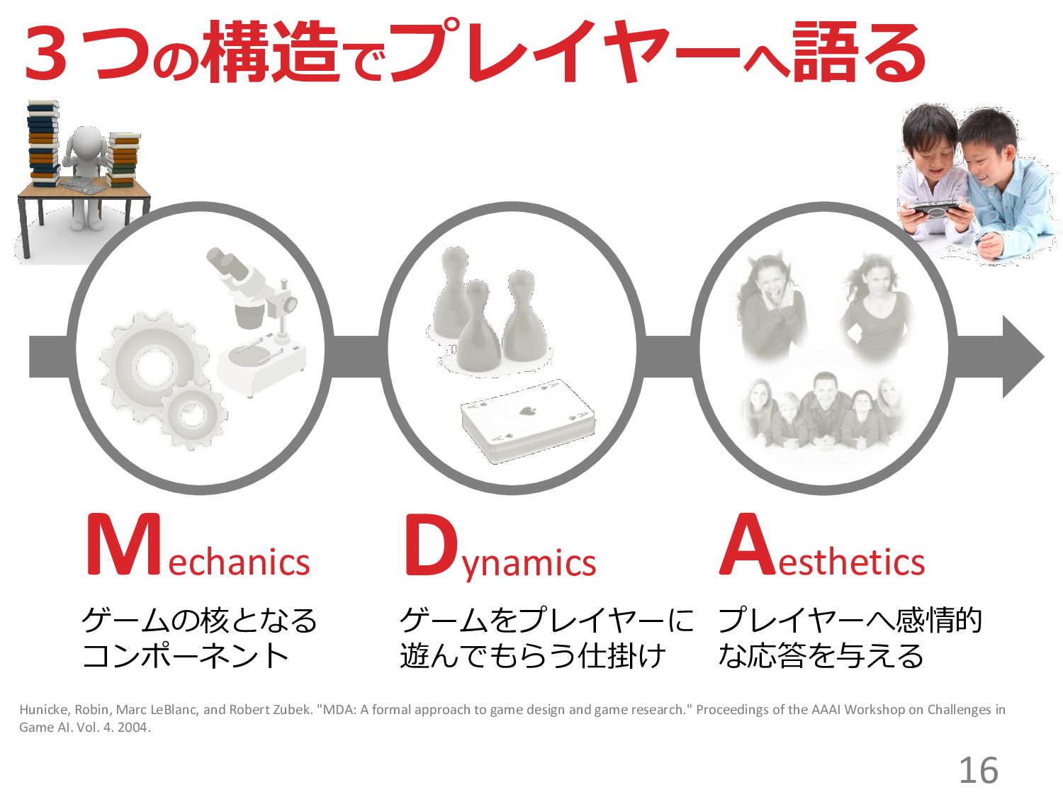 A formal approach to game design and game research." Proceedings of the AAAI Workshop on Challenges in Game AI. Vol. 4. 2004. Mechanics Dynamics Aesthetics ゲームの核となる コンポーネント ゲームをプレヤーに 遊んでもらう仕掛け プレヤーへ感情的 な応答を与える