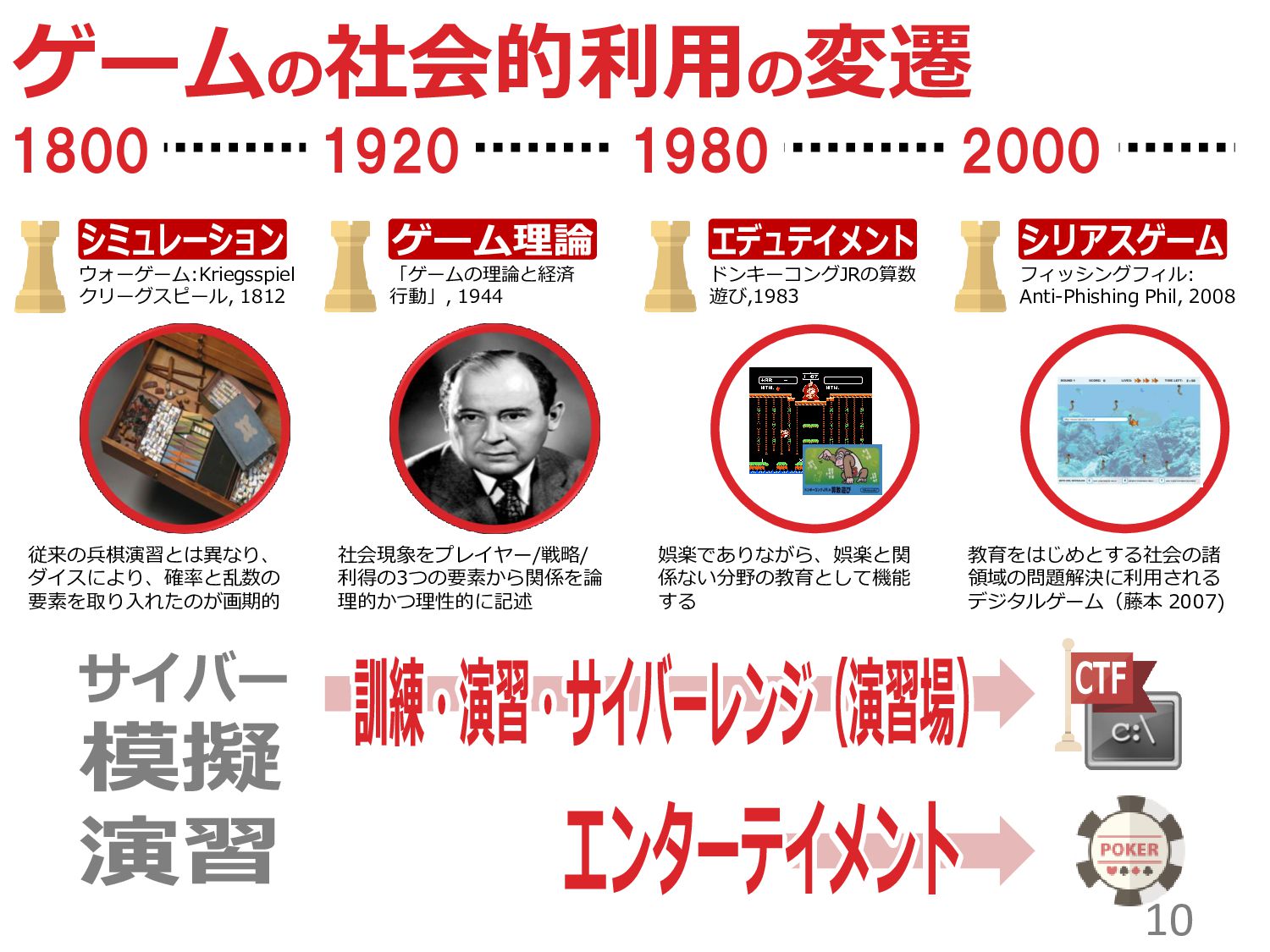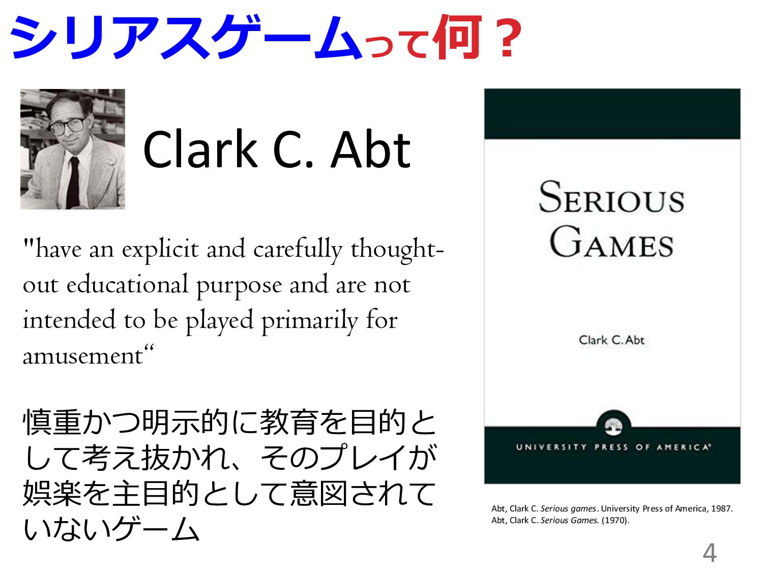 out educational purpose and are not intended to be played primarily for amusement“ 慎重かつ明示的に教育を目的と して考え抜かれ、そのプレが 娯楽を主目的として意図されて いないゲーム シリアスゲームって何? Abt, Clark C. Serious games. University Press of America, 1987. Abt, Clark C. Serious Games. (1970).