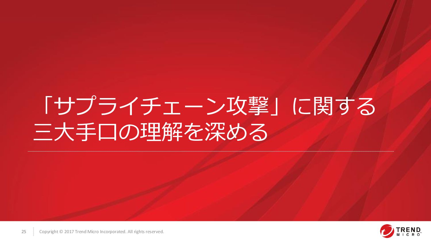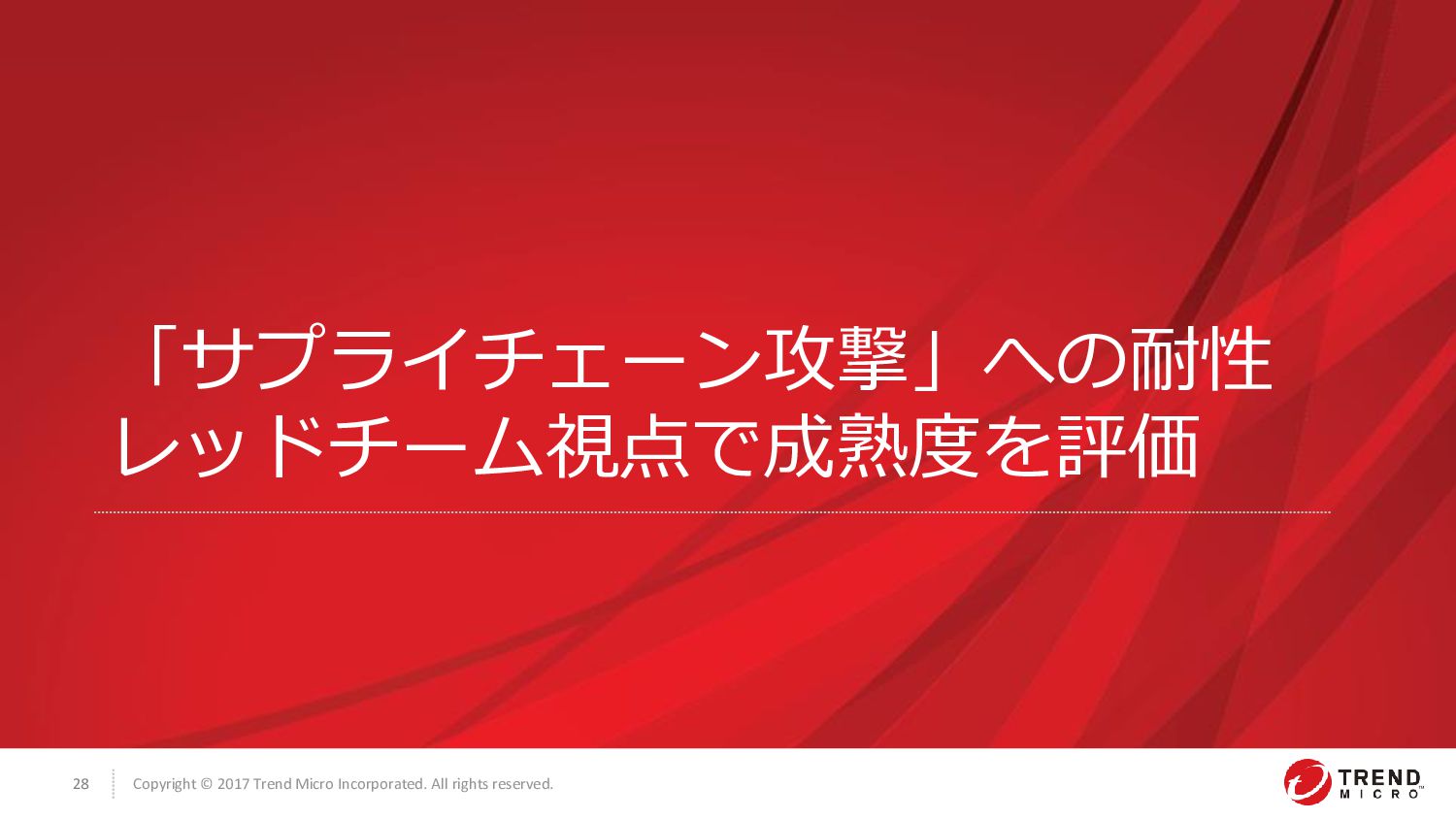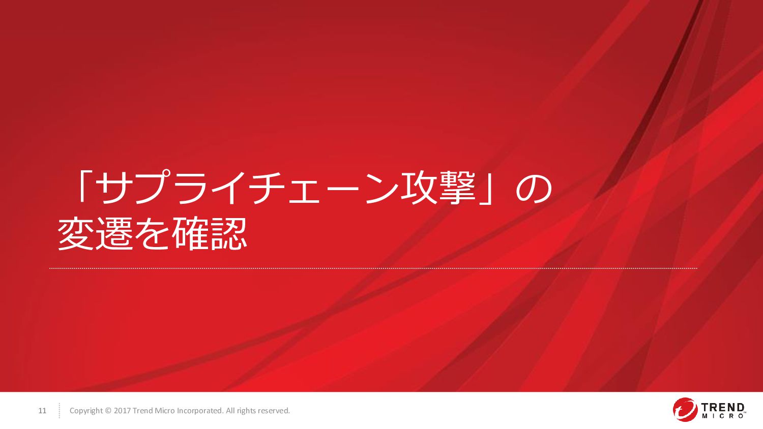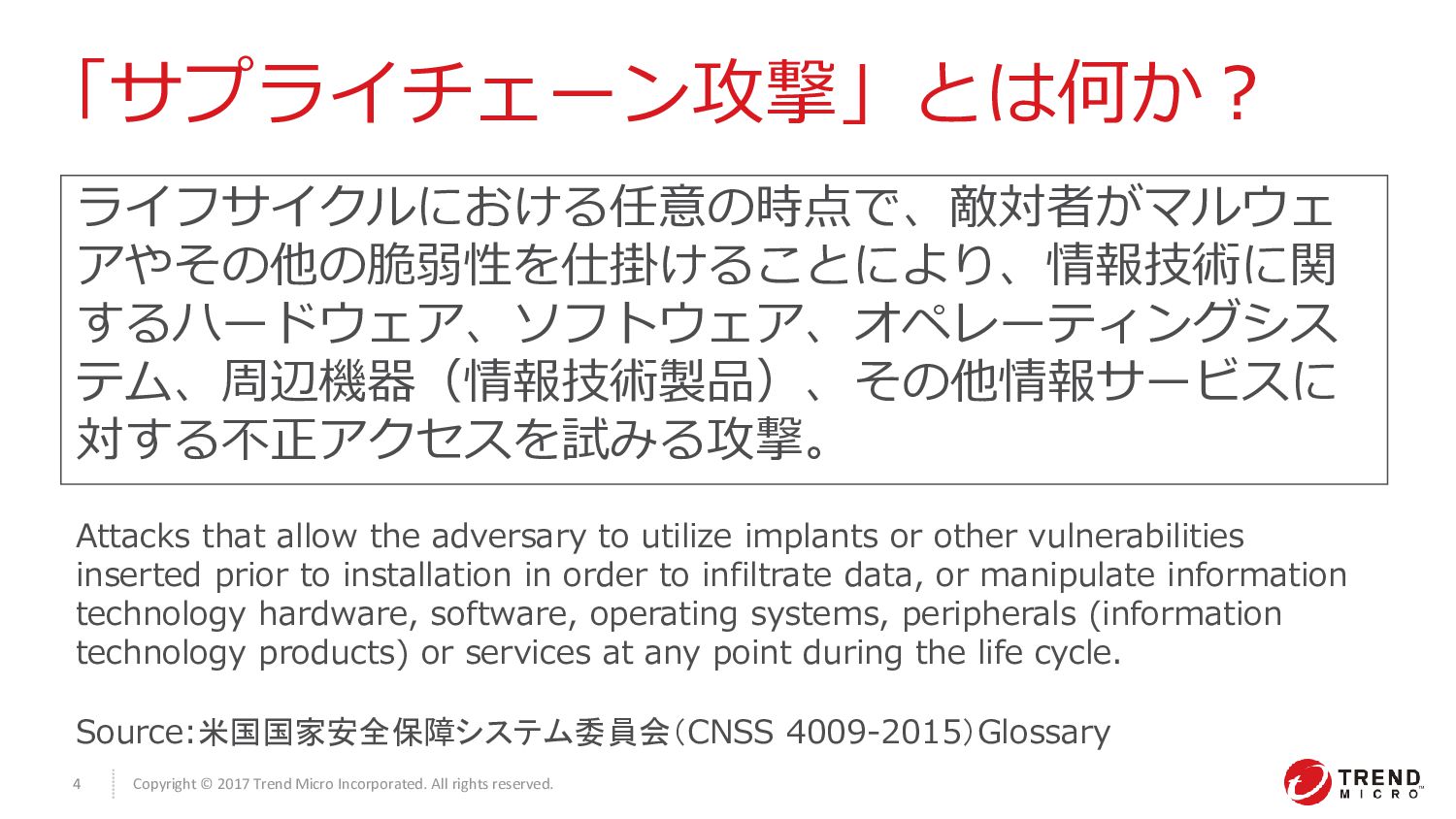 「サプライチェーン攻撃」とは何か? ライフサイクルにおける任意の時点で、敵対者がマルウェ アやその他の脆弱性を仕掛けることにより、情報技術に関 するハードウェア、ソフトウェア、オペレーティングシス テム、周辺機器(情報技術製品)、その他情報サービスに 対する不正アクセスを試みる攻撃。 Attacks that allow the adversary to utilize implants or other vulnerabilities inserted prior to installation in order to infiltrate data, or manipulate information technology hardware, software, operating systems, peripherals (information technology products) or services at any point during the life cycle. Source:米国国家安全保障システム委員会(CNSS 4009-2015)Glossary