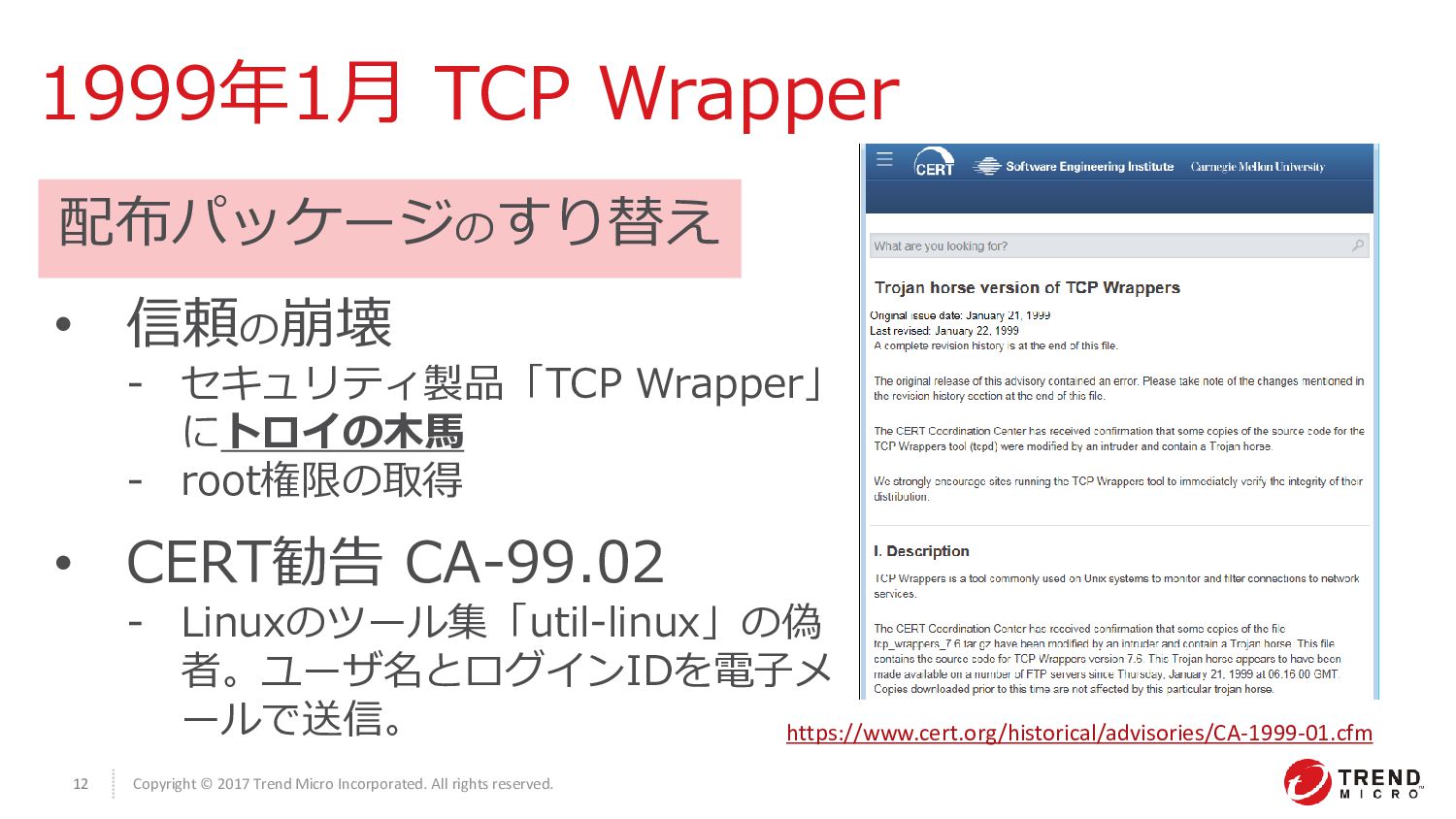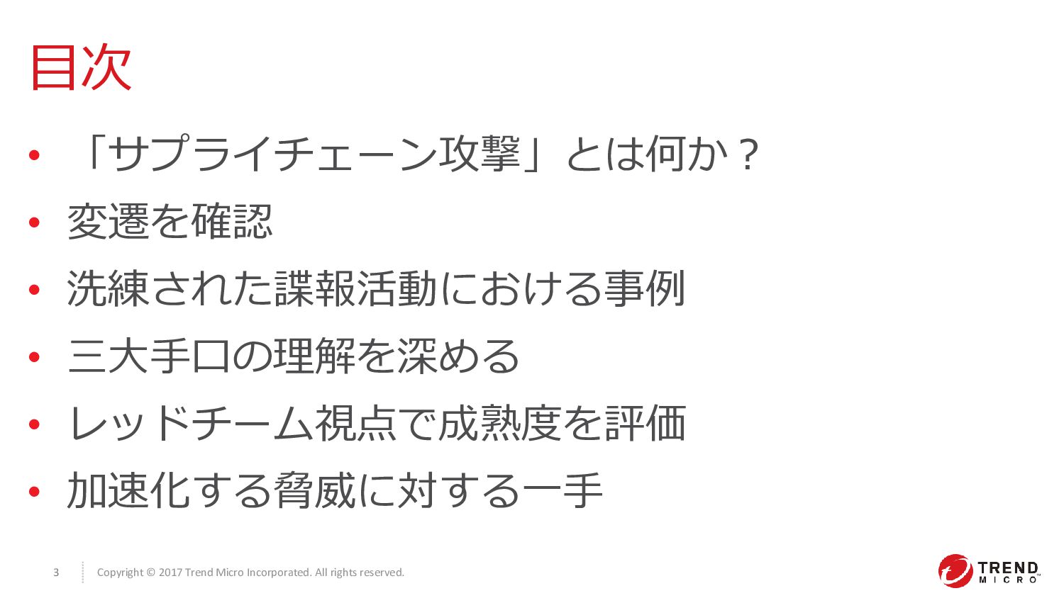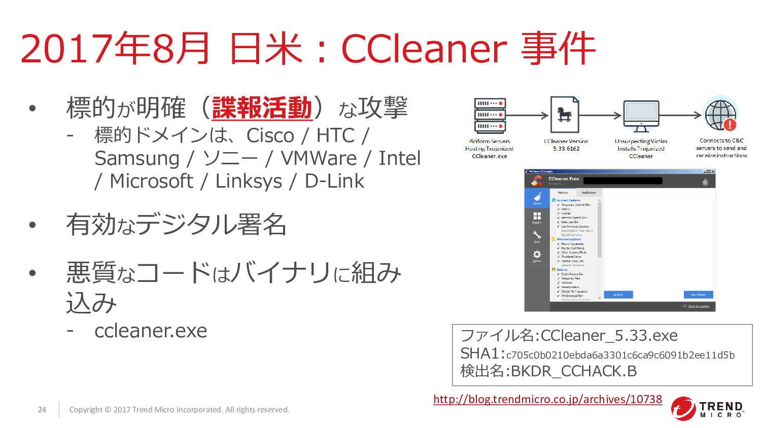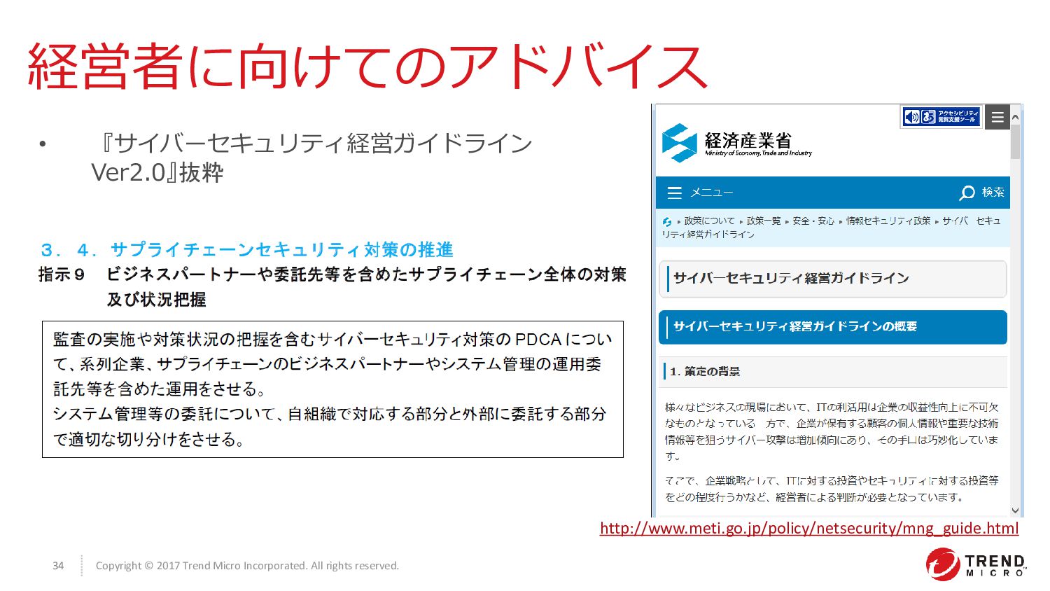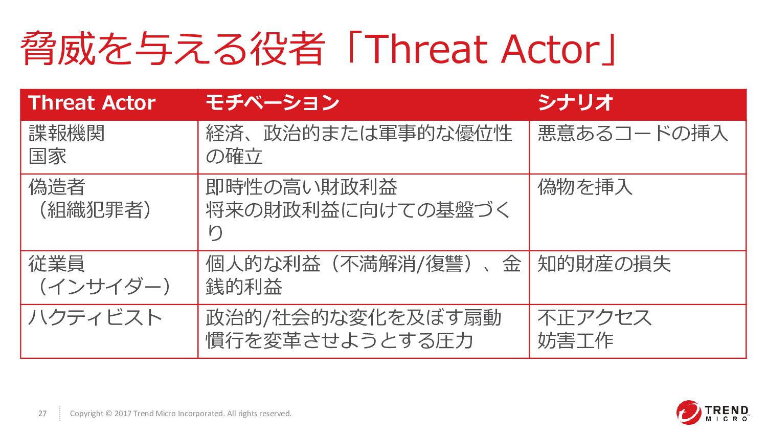 「サプライチェーン攻撃」とは何か? ライフサイクルにおける任意の時点で、敵対者がマルウェ アやその他の脆弱性を仕掛けることにより、情報技術に関 するハードウェア、ソフトウェア、オペレーティングシス テム、周辺機器(情報技術製品)、その他情報サービスに 対する不正アクセスを試みる攻撃。 Attacks that allow the adversary to utilize implants or other vulnerabilities inserted prior to installation in order to infiltrate data, or manipulate information technology hardware, software, operating systems, peripherals (information technology products) or services at any point during the life cycle. Source:米国国家安全保障システム委員会(CNSS 4009-2015)Glossary