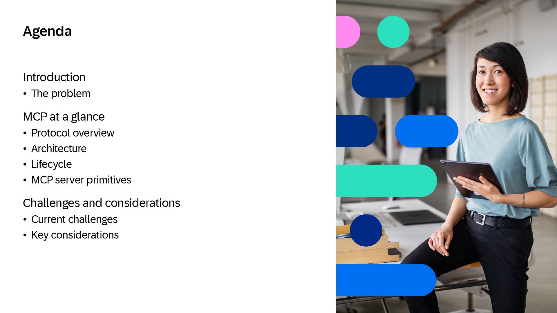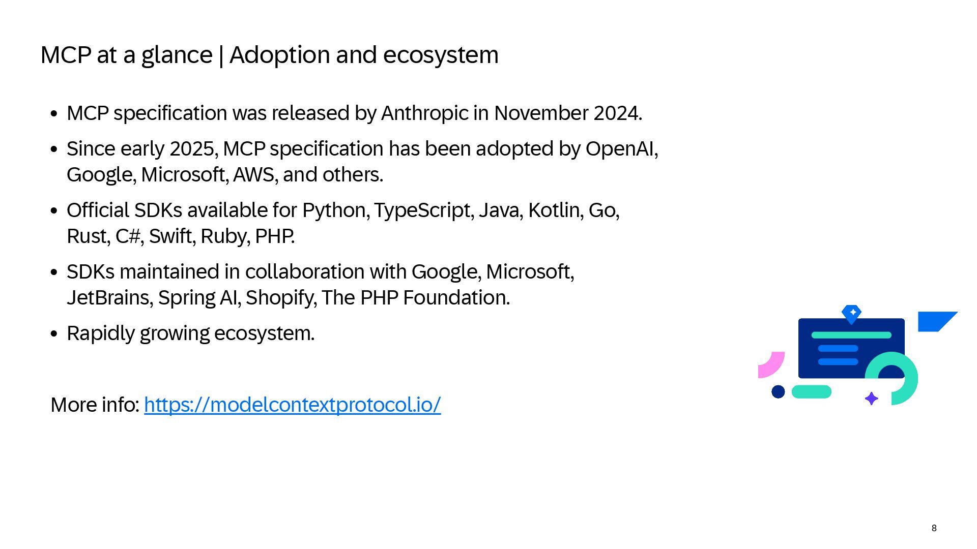 2024. • Since early 2025, MCP specification has been adopted by OpenAI, Google, Microsoft, AWS, and others. • Official SDKs available for Python, TypeScript, Java, Kotlin, Go, Rust, C#, Swift, Ruby, PHP. • SDKs maintained in collaboration with Google, Microsoft, JetBrains, Spring AI, Shopify, The PHP Foundation. • Rapidly growing ecosystem. More info: https://modelcontextprotocol.io/ MCP at a glance | Adoption and ecosystem