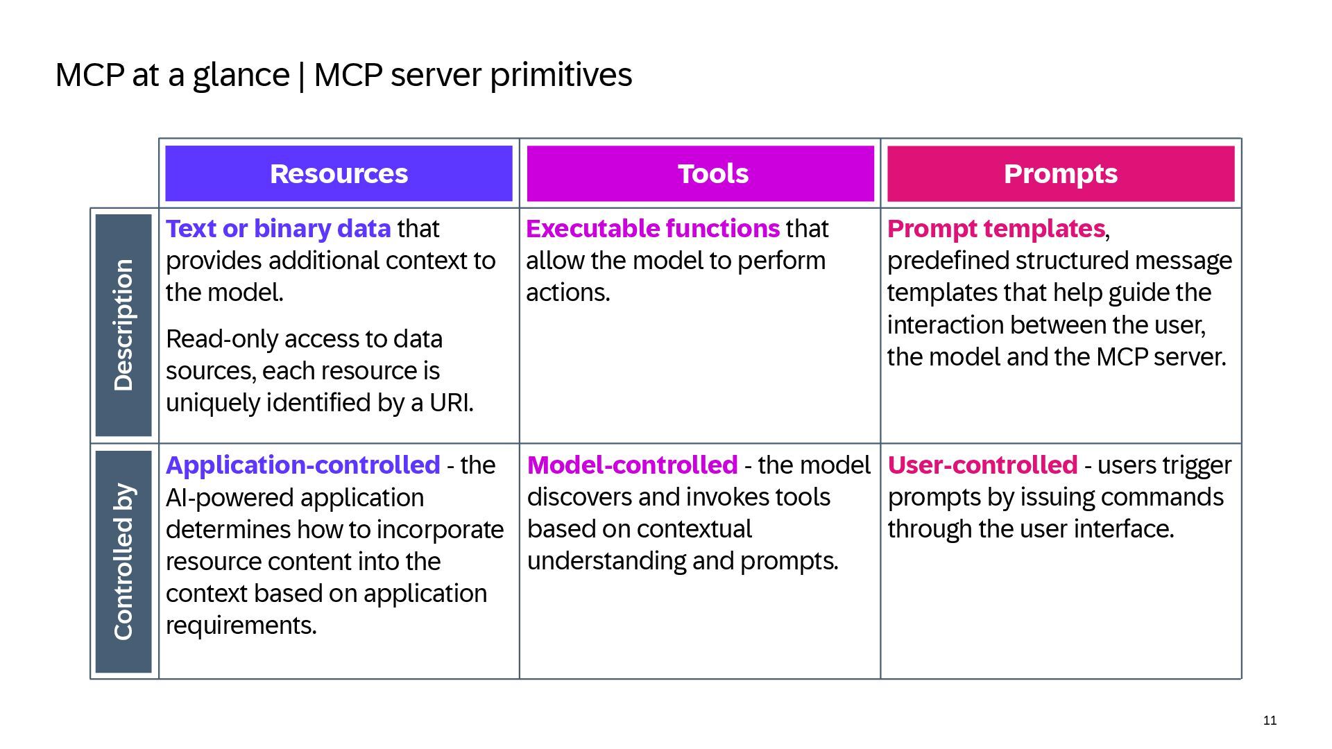 the model. Read-only access to data sources, each resource is uniquely identified by a URI. MCP at a glance | MCP server primitives Resources Tools Prompts Executable functions that allow the model to perform actions. Prompt templates, predefined structured message templates that help guide the interaction between the user, the model and the MCP server. Application-controlled - the AI-powered application determines how to incorporate resource content into the context based on application requirements. Model-controlled - the model discovers and invokes tools based on contextual understanding and prompts. User-controlled - users trigger prompts by issuing commands through the user interface. Description Controlled by