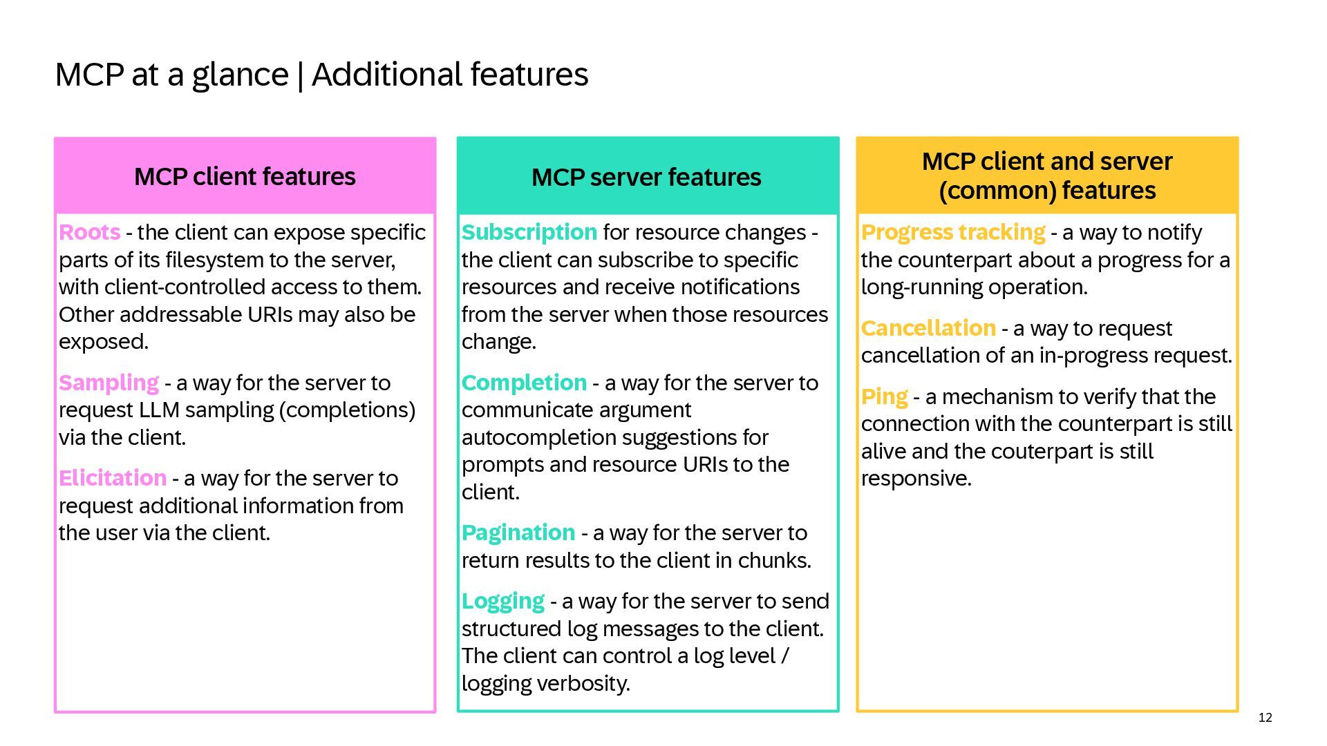 features MCP server features Roots - the client can expose specific parts of its filesystem to the server, with client-controlled access to them. Other addressable URIs may also be exposed. Sampling - a way for the server to request LLM sampling (completions) via the client. Elicitation - a way for the server to request additional information from the user via the client. Subscription for resource changes - the client can subscribe to specific resources and receive notifications from the server when those resources change. Completion - a way for the server to communicate argument autocompletion suggestions for prompts and resource URIs to the client. Pagination - a way for the server to return results to the client in chunks. Logging - a way for the server to send structured log messages to the client. The client can control a log level / logging verbosity. MCP client and server (common) features Progress tracking - a way to notify the counterpart about a progress for a long-running operation. Cancellation - a way to request cancellation of an in-progress request. Ping - a mechanism to verify that the connection with the counterpart is still alive and the couterpart is still responsive.