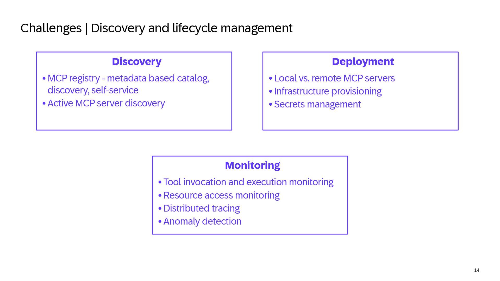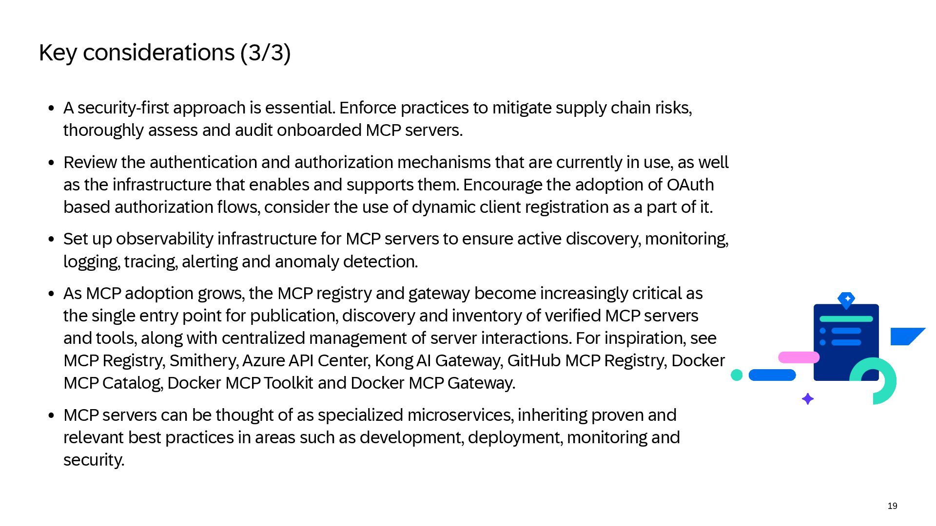 mitigate supply chain risks, thoroughly assess and audit onboarded MCP servers. • Review the authentication and authorization mechanisms that are currently in use, as well as the infrastructure that enables and supports them. Encourage the adoption of OAuth based authorization flows, consider the use of dynamic client registration as a part of it. • Set up observability infrastructure for MCP servers to ensure active discovery, monitoring, logging, tracing, alerting and anomaly detection. • As MCP adoption grows, the MCP registry and gateway become increasingly critical as the single entry point for publication, discovery and inventory of verified MCP servers and tools, along with centralized management of server interactions. For inspiration, see MCP Registry, Smithery, Azure API Center, Kong AI Gateway, GitHub MCP Registry, Docker MCP Catalog, Docker MCP Toolkit and Docker MCP Gateway. • MCP servers can be thought of as specialized microservices, inheriting proven and relevant best practices in areas such as development, deployment, monitoring and security. Key considerations (3/3)