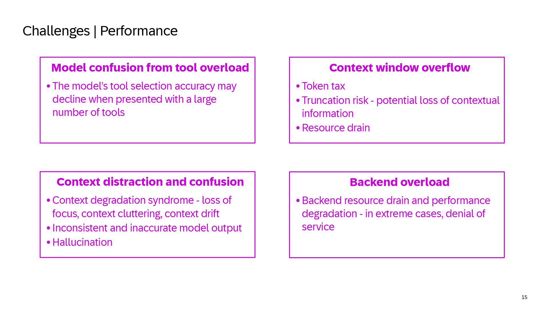 The model’s tool selection accuracy may decline when presented with a large number of tools Context distraction and confusion • Context degradation syndrome - loss of focus, context cluttering, context drift • Inconsistent and inaccurate model output • Hallucination Context window overflow • Token tax • Truncation risk - potential loss of contextual information • Resource drain Backend overload • Backend resource drain and performance degradation - in extreme cases, denial of service