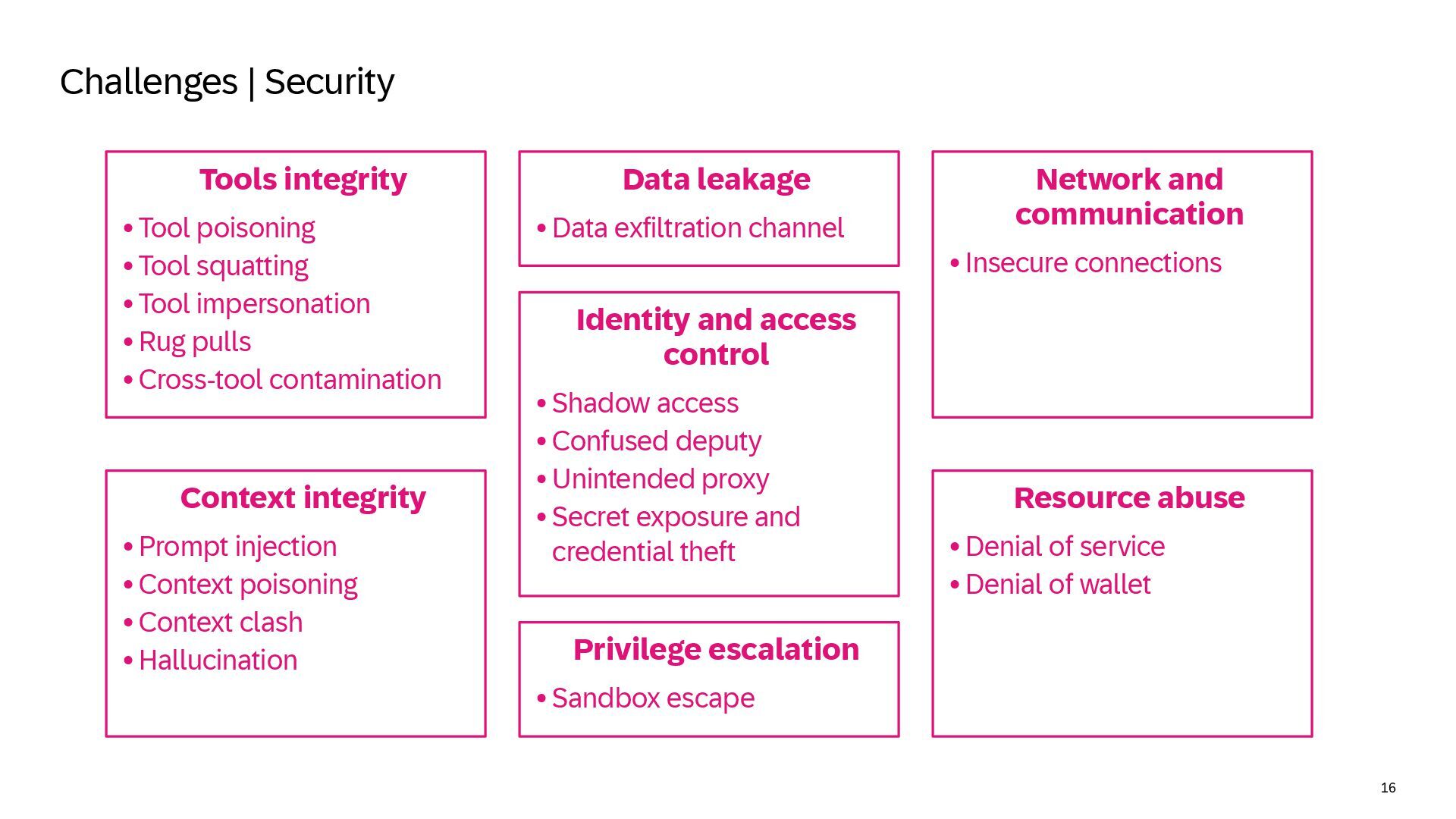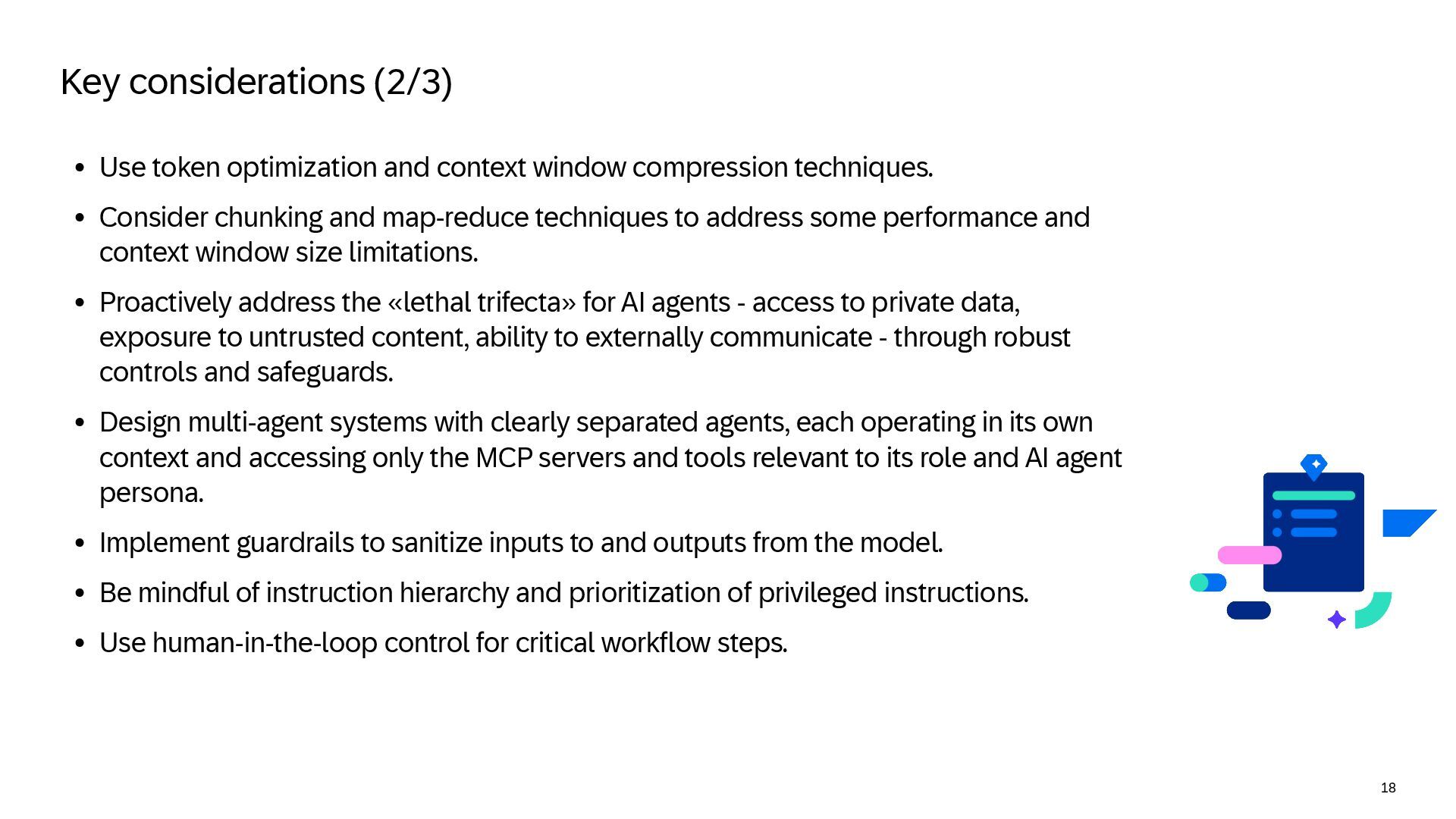 • Consider chunking and map-reduce techniques to address some performance and context window size limitations. • Proactively address the «lethal trifecta» for AI agents - access to private data, exposure to untrusted content, ability to externally communicate - through robust controls and safeguards. • Design multi-agent systems with clearly separated agents, each operating in its own context and accessing only the MCP servers and tools relevant to its role and AI agent persona. • Implement guardrails to sanitize inputs to and outputs from the model. • Be mindful of instruction hierarchy and prioritization of privileged instructions. • Use human-in-the-loop control for critical workflow steps. Key considerations (2/3)