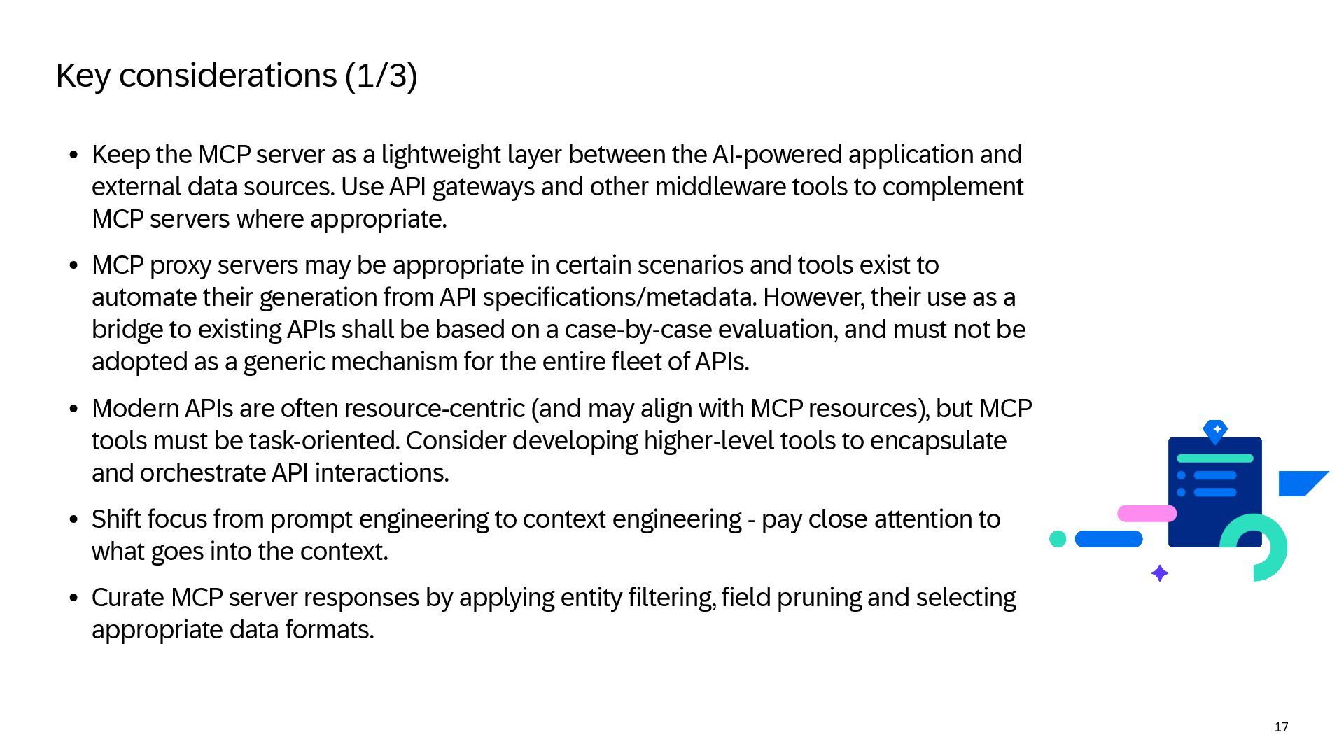between the AI-powered application and external data sources. Use API gateways and other middleware tools to complement MCP servers where appropriate. • MCP proxy servers may be appropriate in certain scenarios and tools exist to automate their generation from API specifications/metadata. However, their use as a bridge to existing APIs shall be based on a case-by-case evaluation, and must not be adopted as a generic mechanism for the entire fleet of APIs. • Modern APIs are often resource-centric (and may align with MCP resources), but MCP tools must be task-oriented. Consider developing higher-level tools to encapsulate and orchestrate API interactions. • Shift focus from prompt engineering to context engineering - pay close attention to what goes into the context. • Curate MCP server responses by applying entity filtering, field pruning and selecting appropriate data formats. Key considerations (1/3)