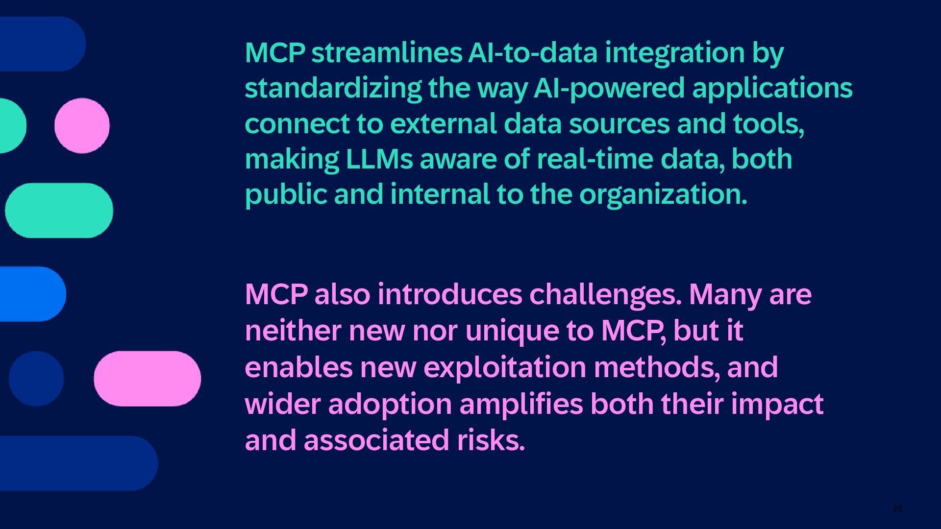 applications connect to external data sources and tools, making LLMs aware of real-time data, both public and internal to the organization. MCP also introduces challenges. Many are neither new nor unique to MCP, but it enables new exploitation methods, and wider adoption amplifies both their impact and associated risks.