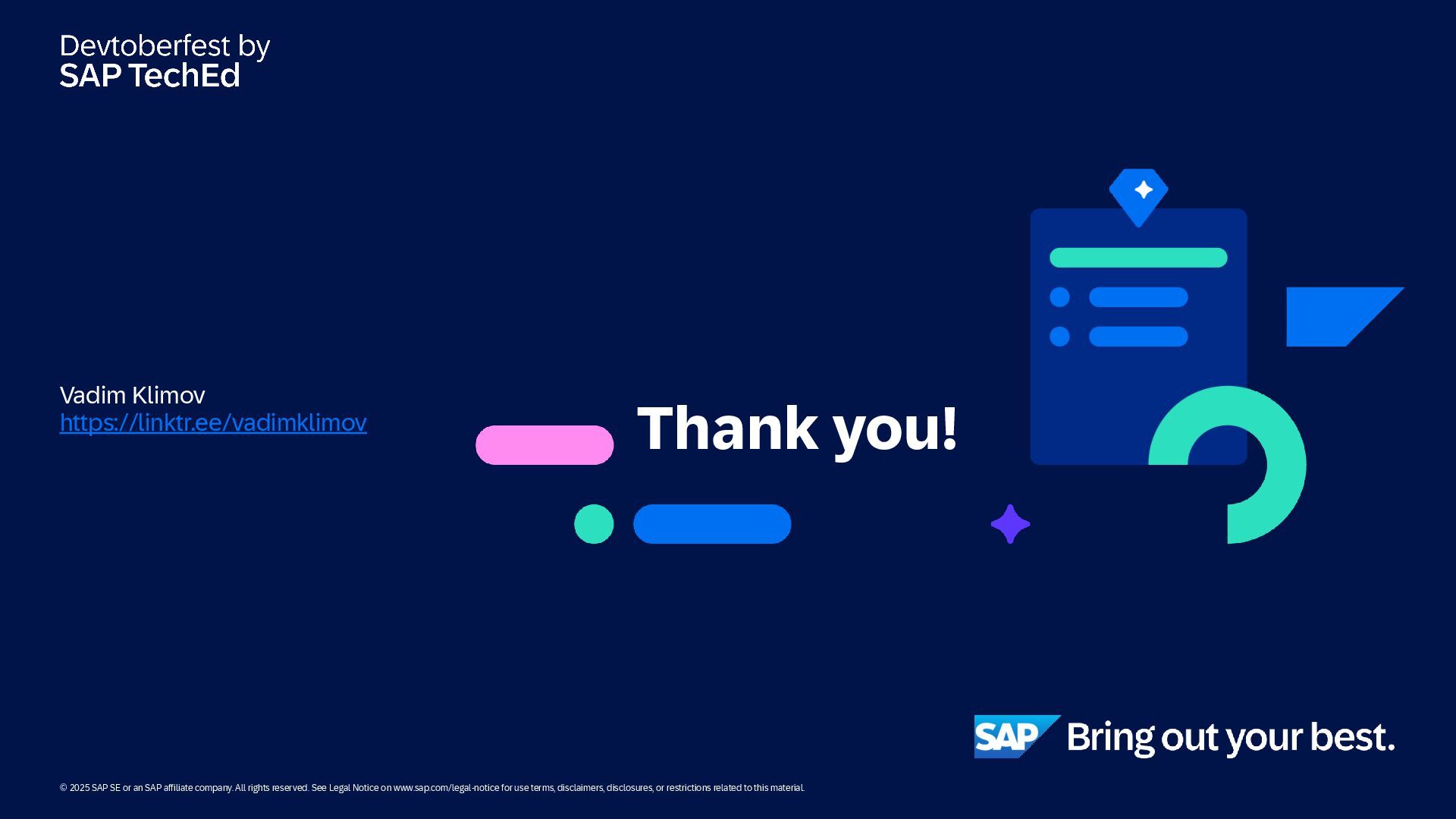rights reserved. See Legal Notice on www.sap.com/legal-notice for use terms, disclaimers, disclosures, or restrictions related to this material. Thank you! Vadim Klimov https://linktr.ee/vadimklimov